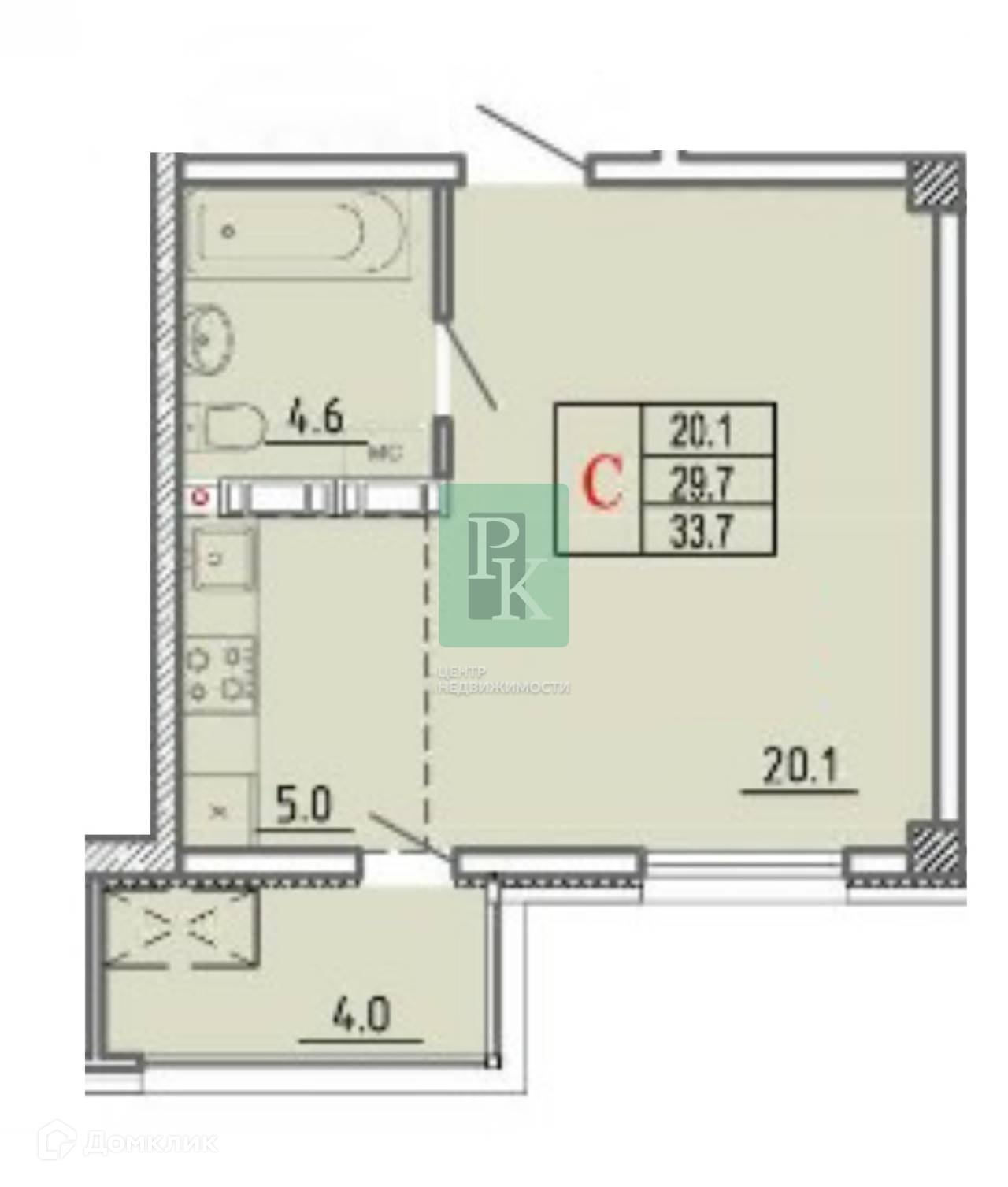 Общая площадь студии с учетом балкона - 33,7 м.кв. Светлая комната 20,1 м.кв. с выходом на балкон – 4 м.кв. Кухня - 5 м.кв. Санузел совмещенный – 4,6 м.кв., высота потолков – 2,72 м.