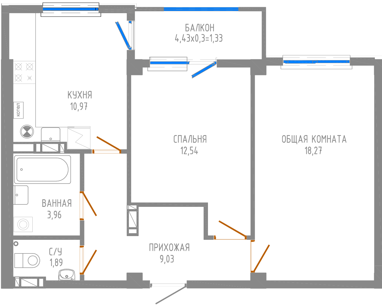 Общая площадь 56.3 м2