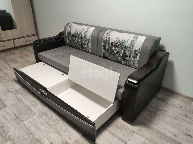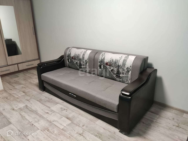 В комнате расположен диван, стенка, вместительный шкаф.