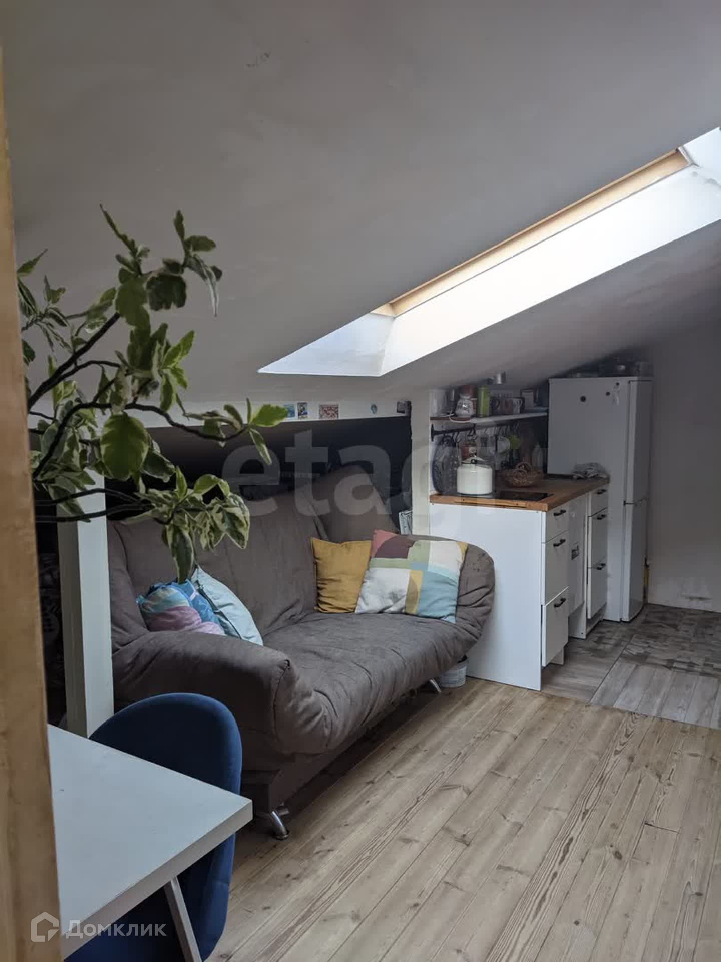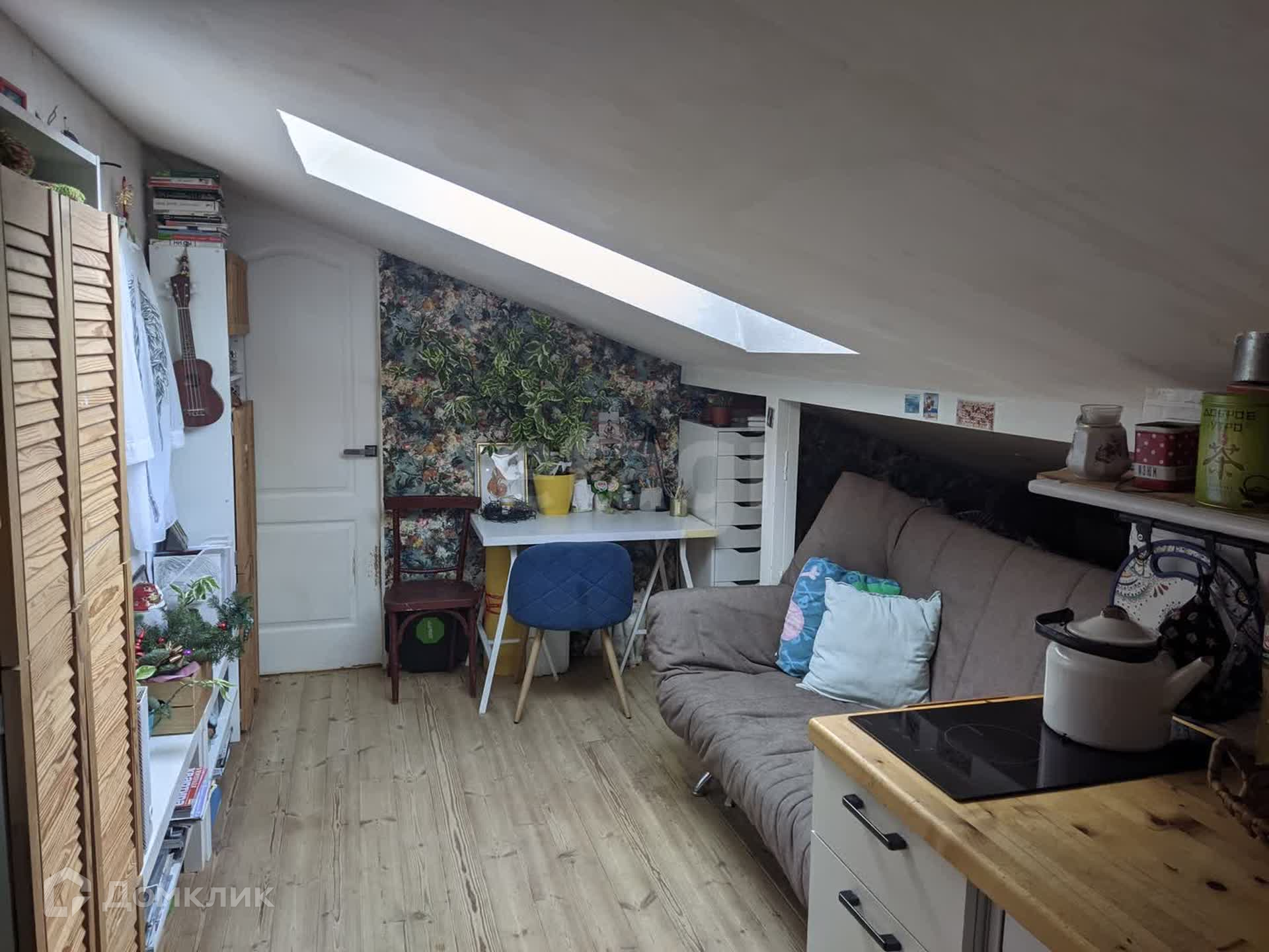 По документам это нежилое помещение - Апартаменты - 42,6 кв.м. общей площадью! Весь мансардный этаж в доме жилой. Помещение состоит из двух комнат и санузла. Комнаты проходные. В первой комнате при входе небольшая кухня с индукционной плитой. Направо санузел, а на лево проходя через комнату - спальня.