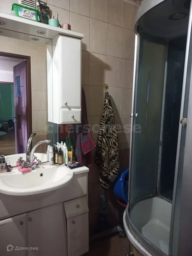 Санузел совмещенный с душевой кабинкой, полотенцесушителем подключенным от отопления и выполняющим роль радиатора отопления в зимнее время.