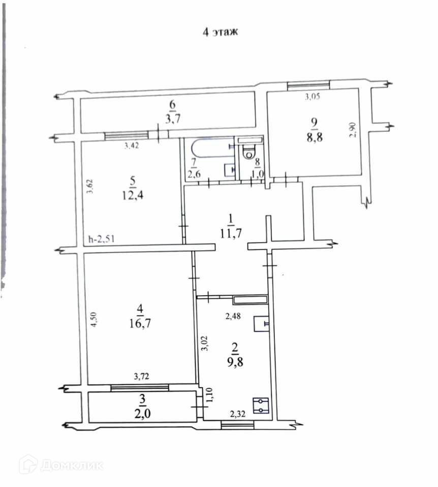 Общая площадь 75м² ; жилая площадь 38м², комнаты раздельные: 16,7м², 12,4м², 8,8м² ; кухня 9,8м²; прихожая 11,7м²; санузел раздельный. Горячее водоснабжение - бойлер, отопление и водоснабжение центральные.