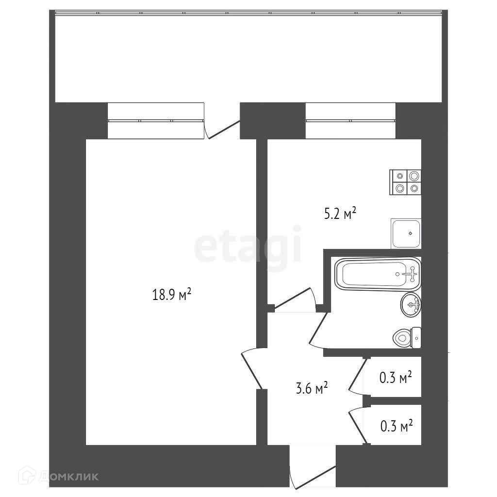 Общая площадь по техплану 32,9 м2, по ЕГРН (без лоджии) 30,6 м2, кухня 5,2 м2, комната 18,9 м2.