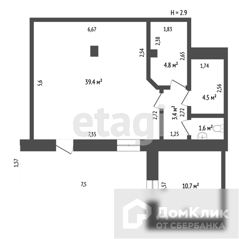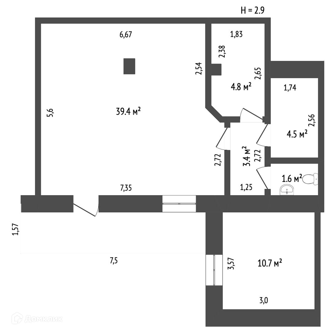 Общая площадь 65 кв.м. Все помещение разделено на 4 комнаты: торговый зал 40 кв.м плюс смежные (подсобные) помещения и санузел.