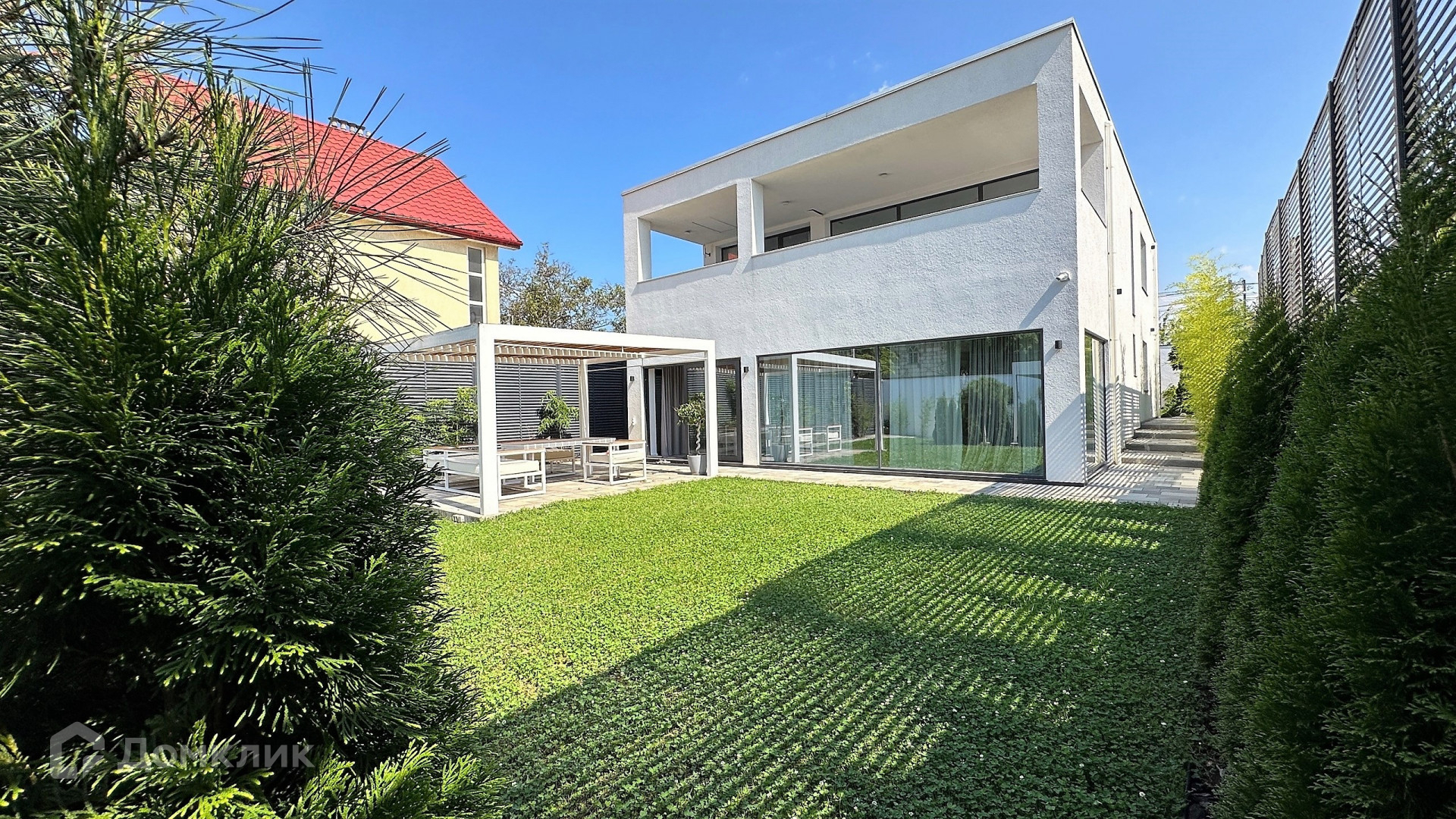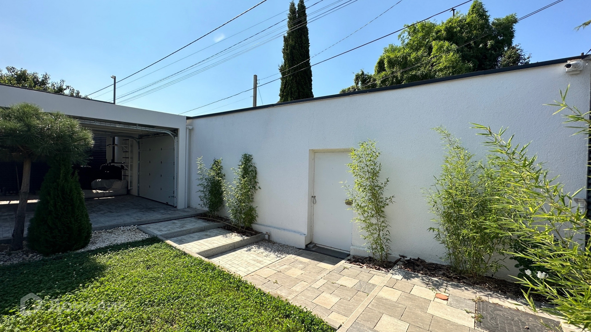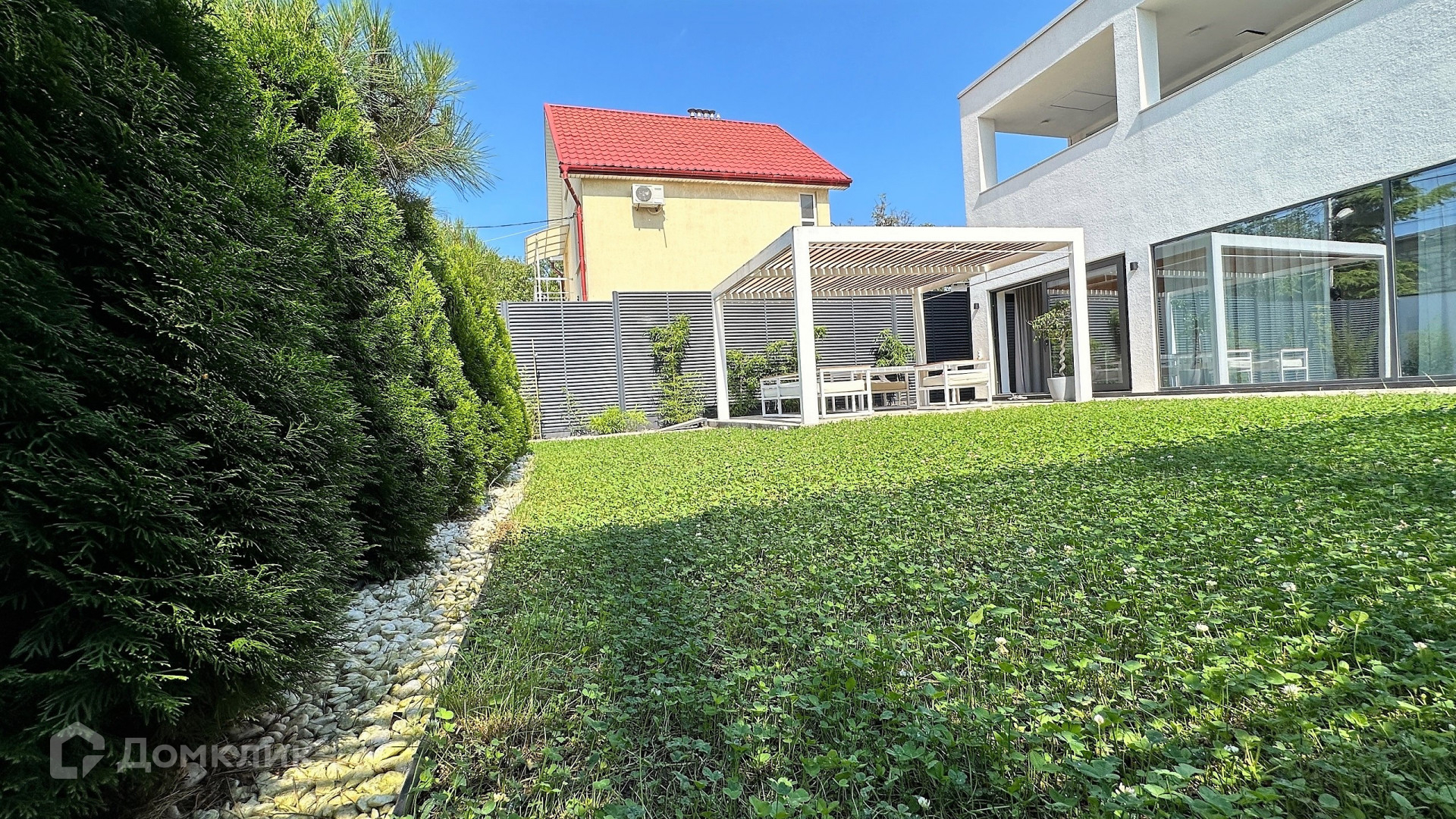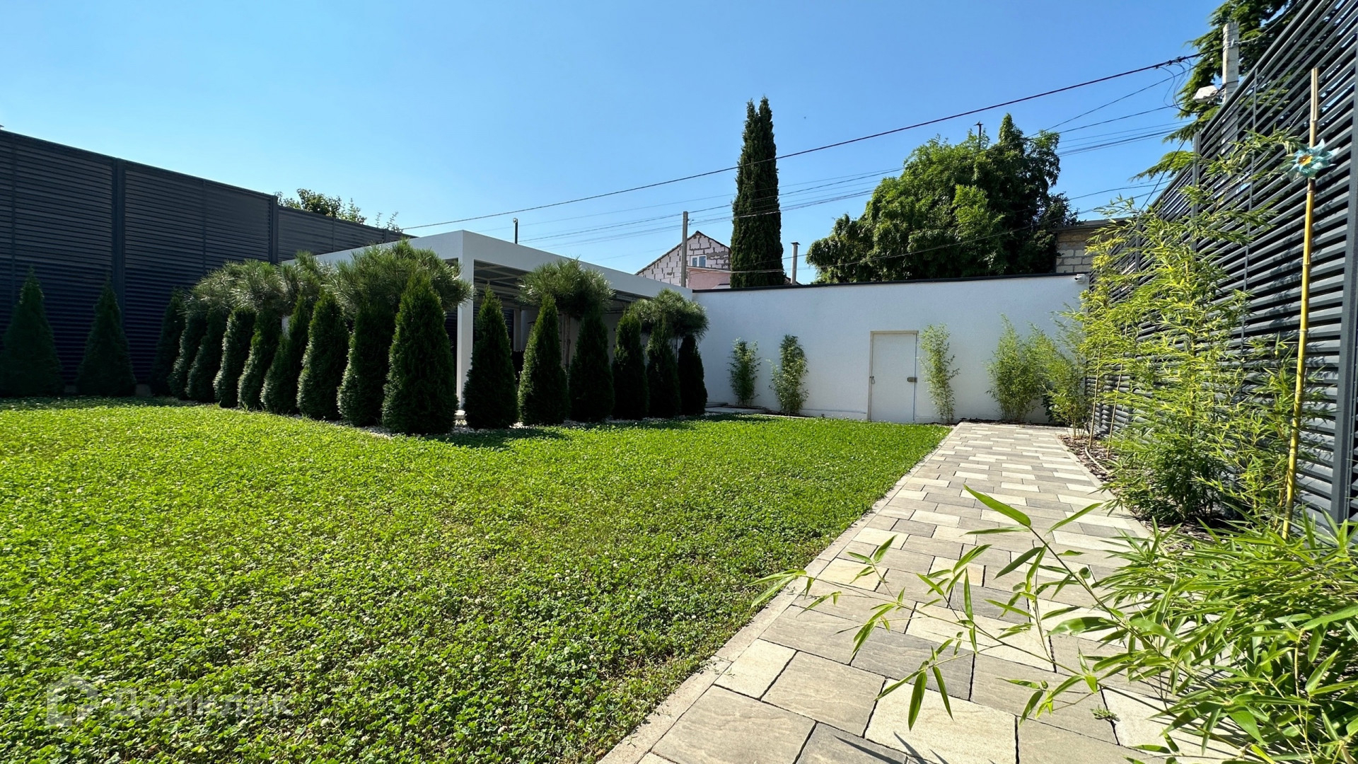 Большая придомовая территория, много зелёной зоны: газоны, розарий, тропические растения, хвойные деревья.