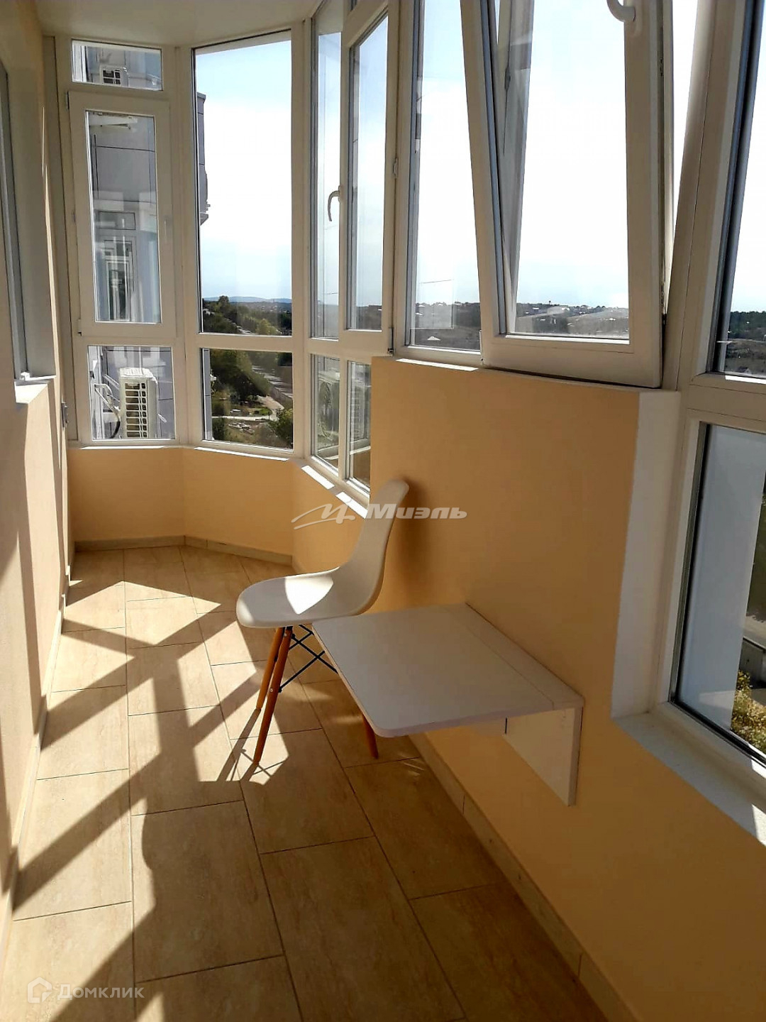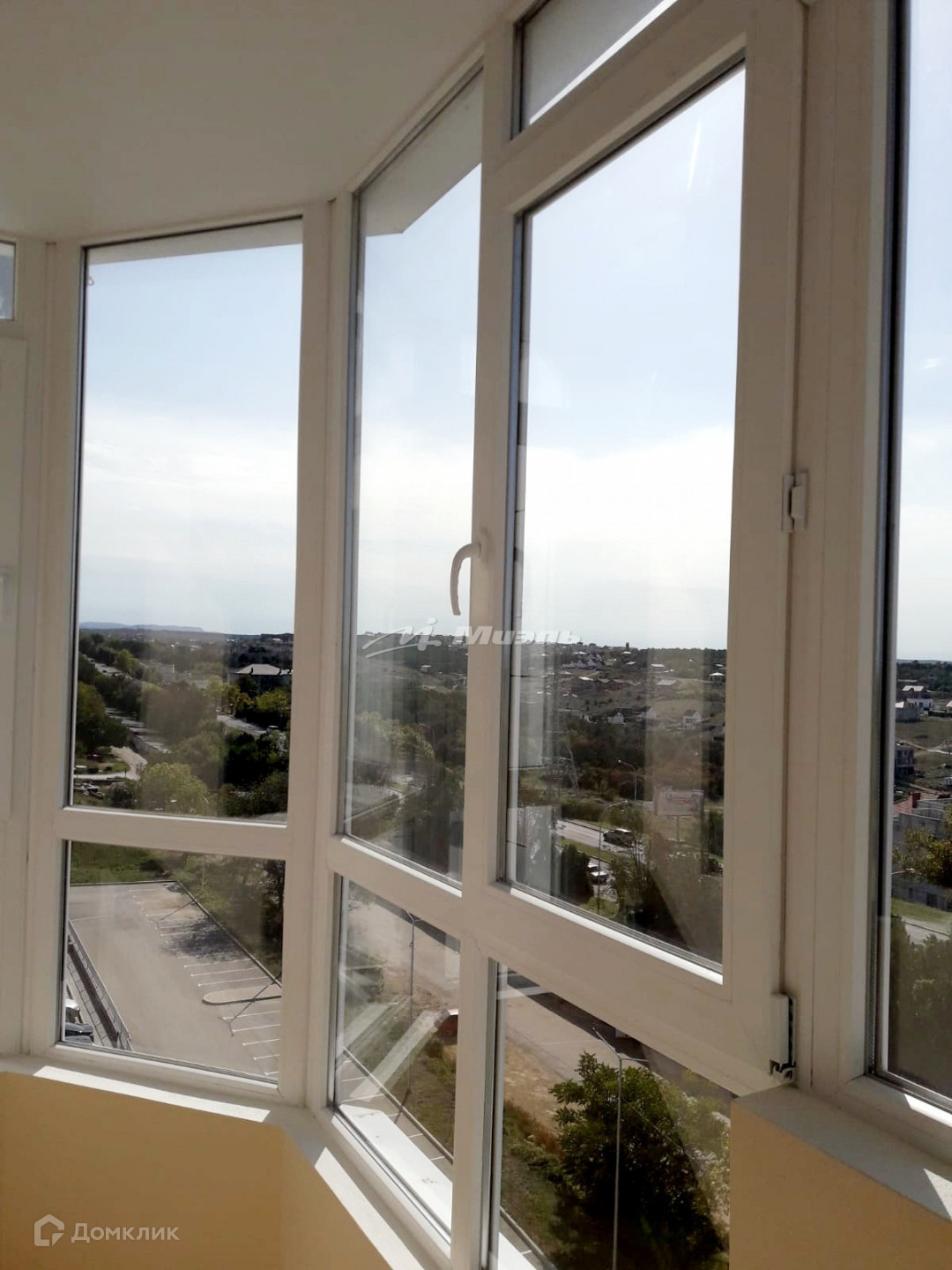Балкон с витражными окнами с которого открывается вид на море.