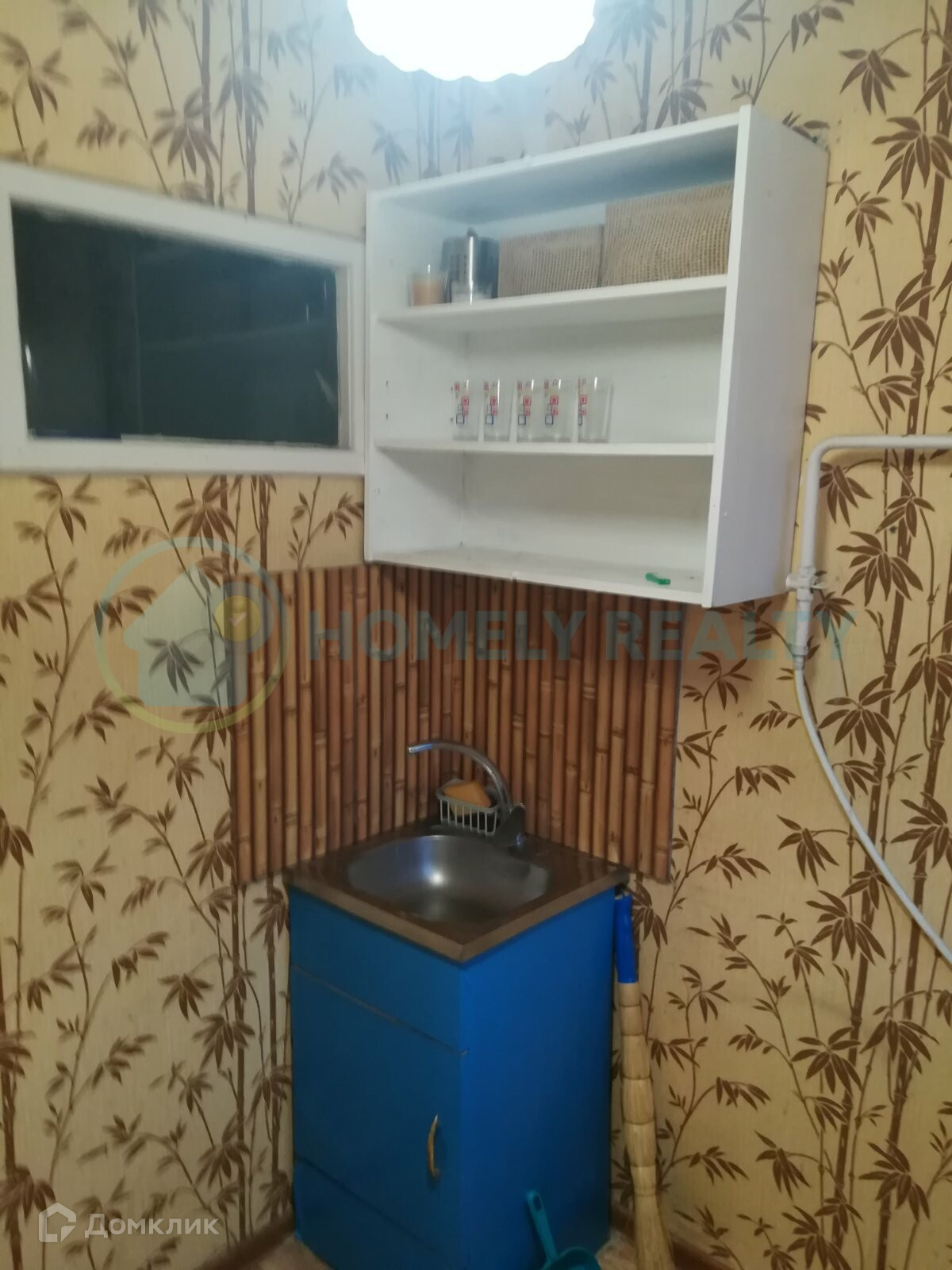 — Квартира частично с мебелью. В комнате комод, диван. На кухне кухонный стол, несколько полок, мойка.
