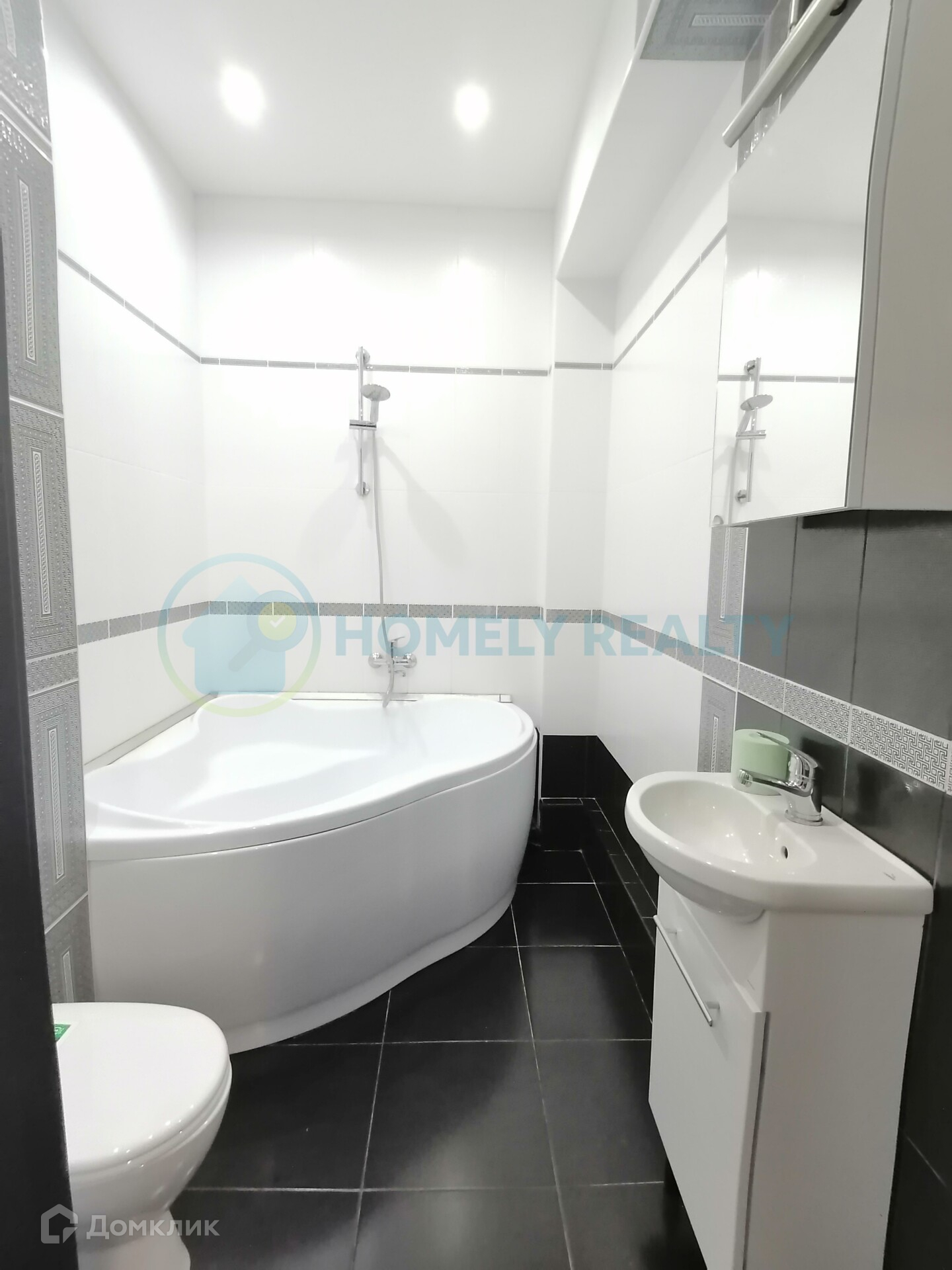 — Санузел совмещённый с большой угловой ванной.