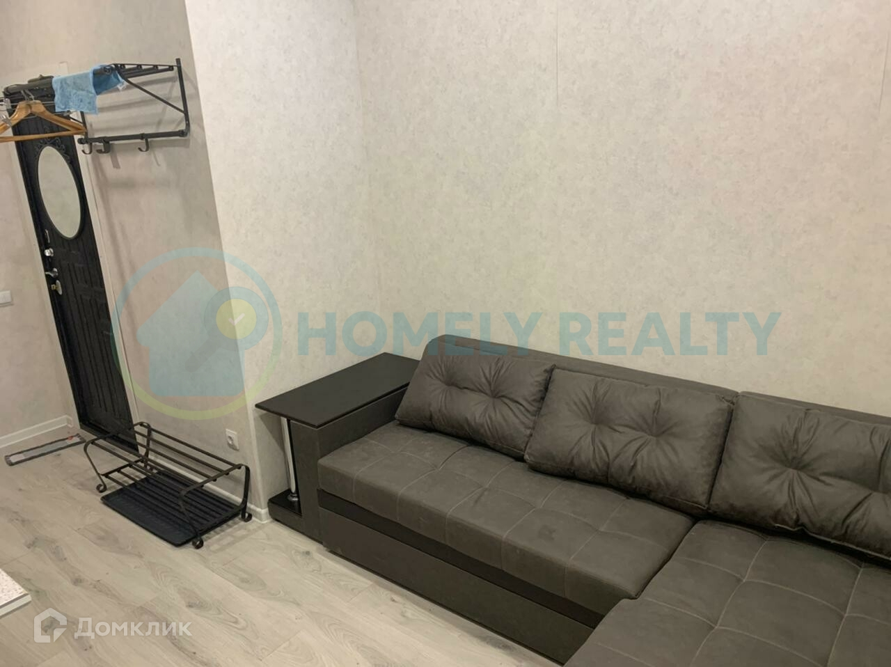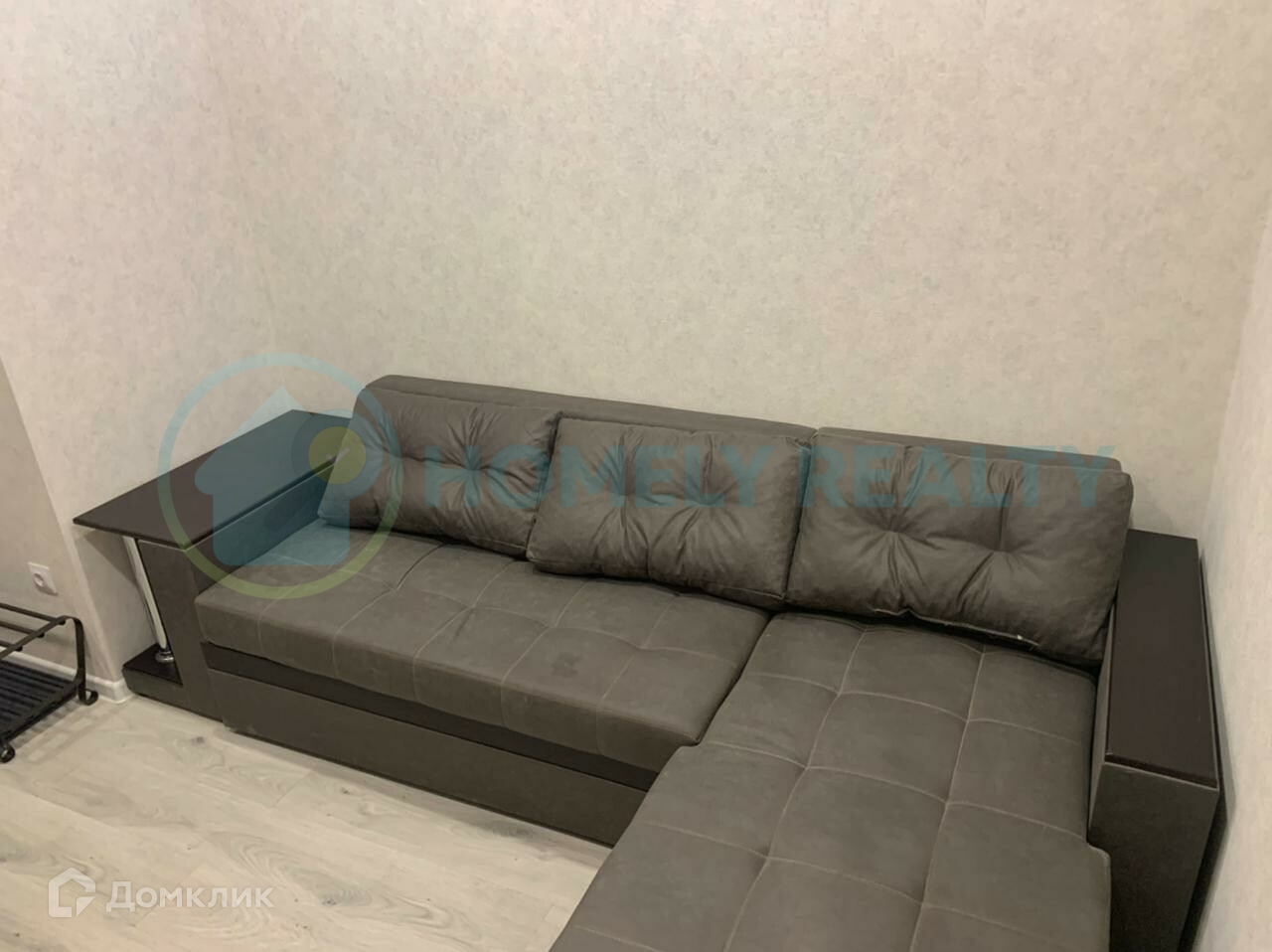 — Мебель: большой угловой диван, кухонная мебель.