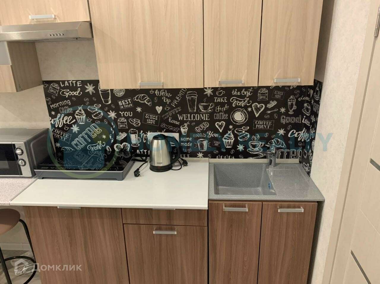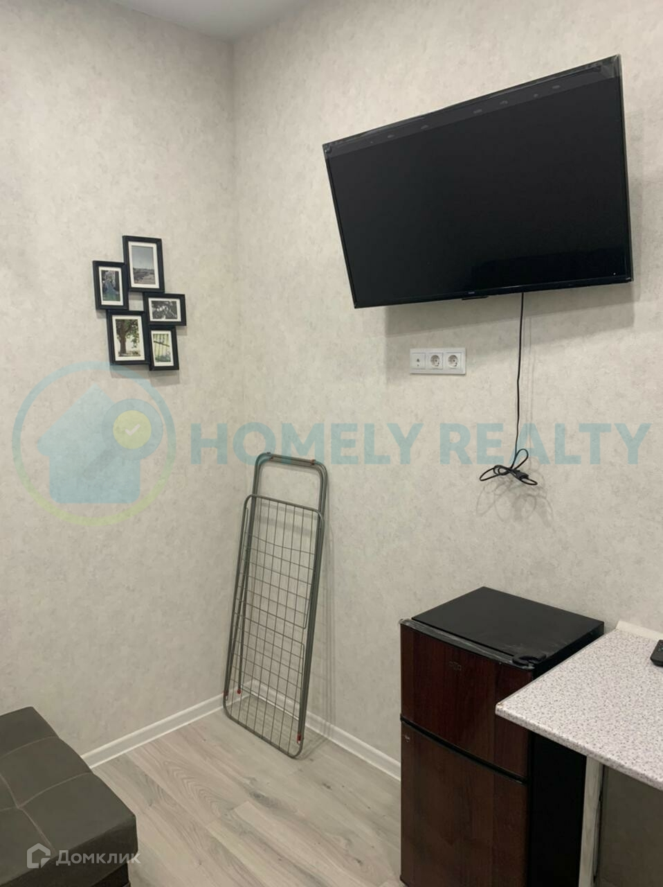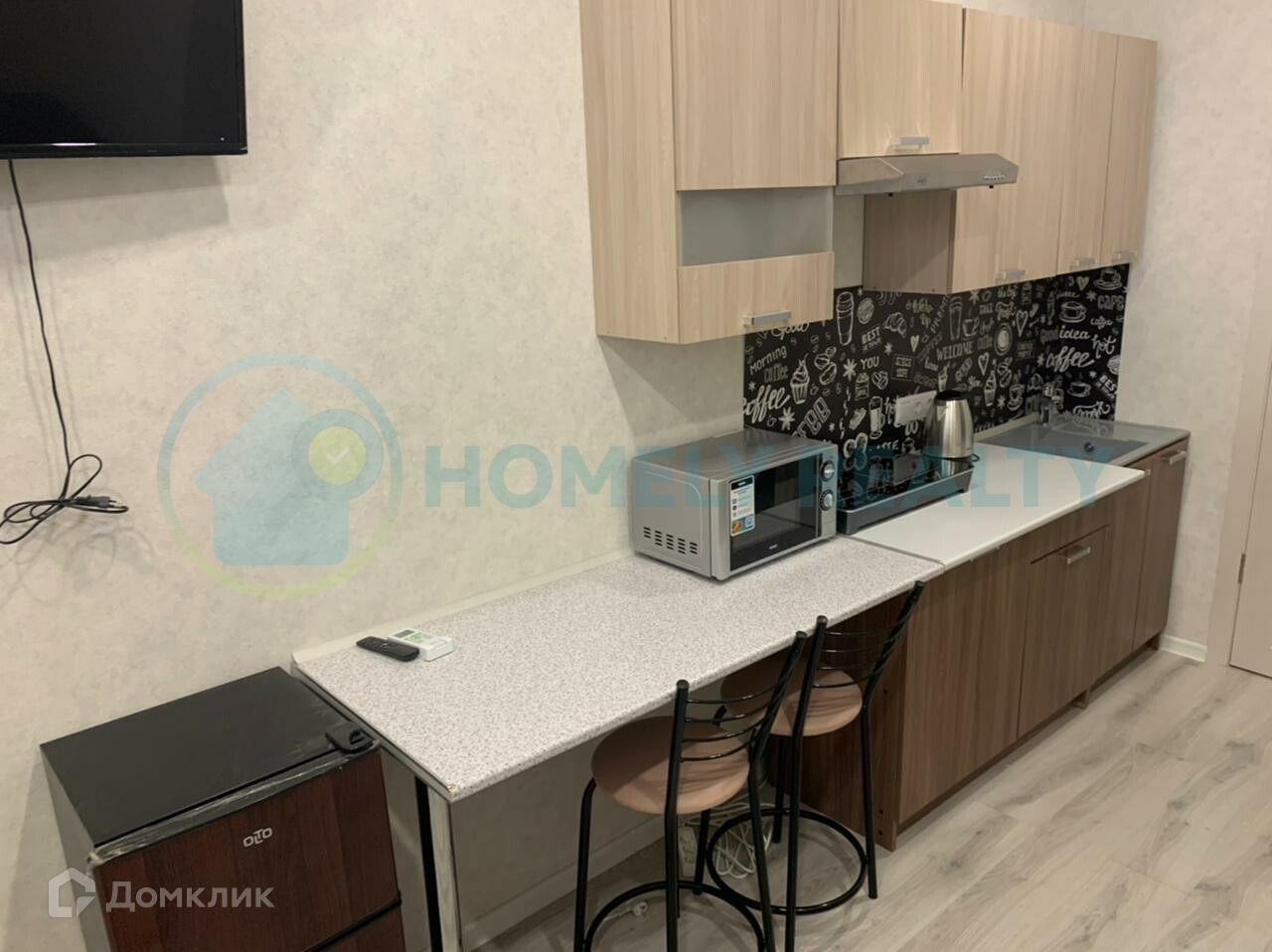 —Техника: телевизор, кондиционер, электрический чайник, электро-плита, микроволновка, стиральная машина (на фото ее нет).