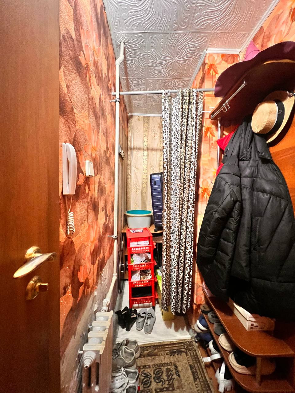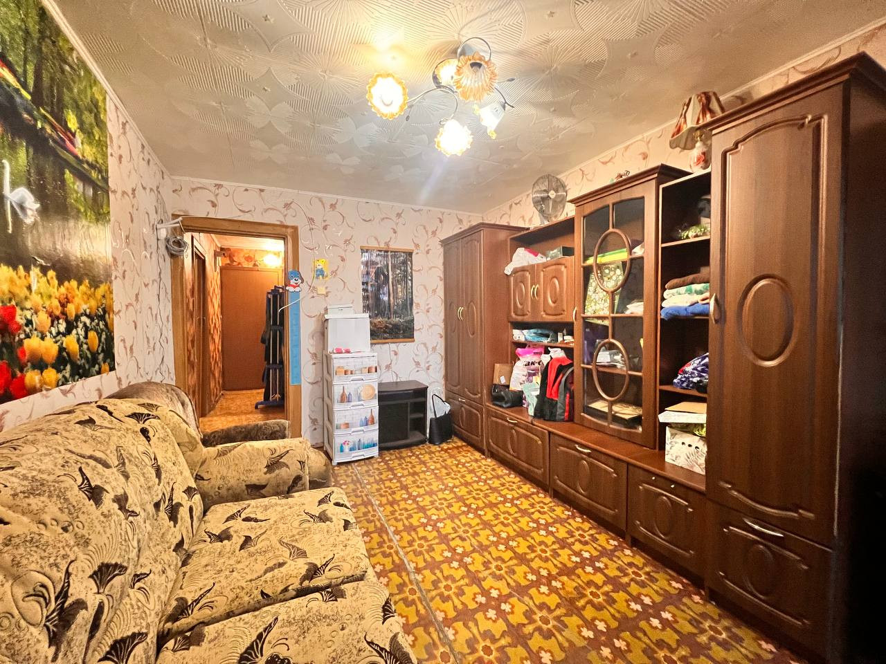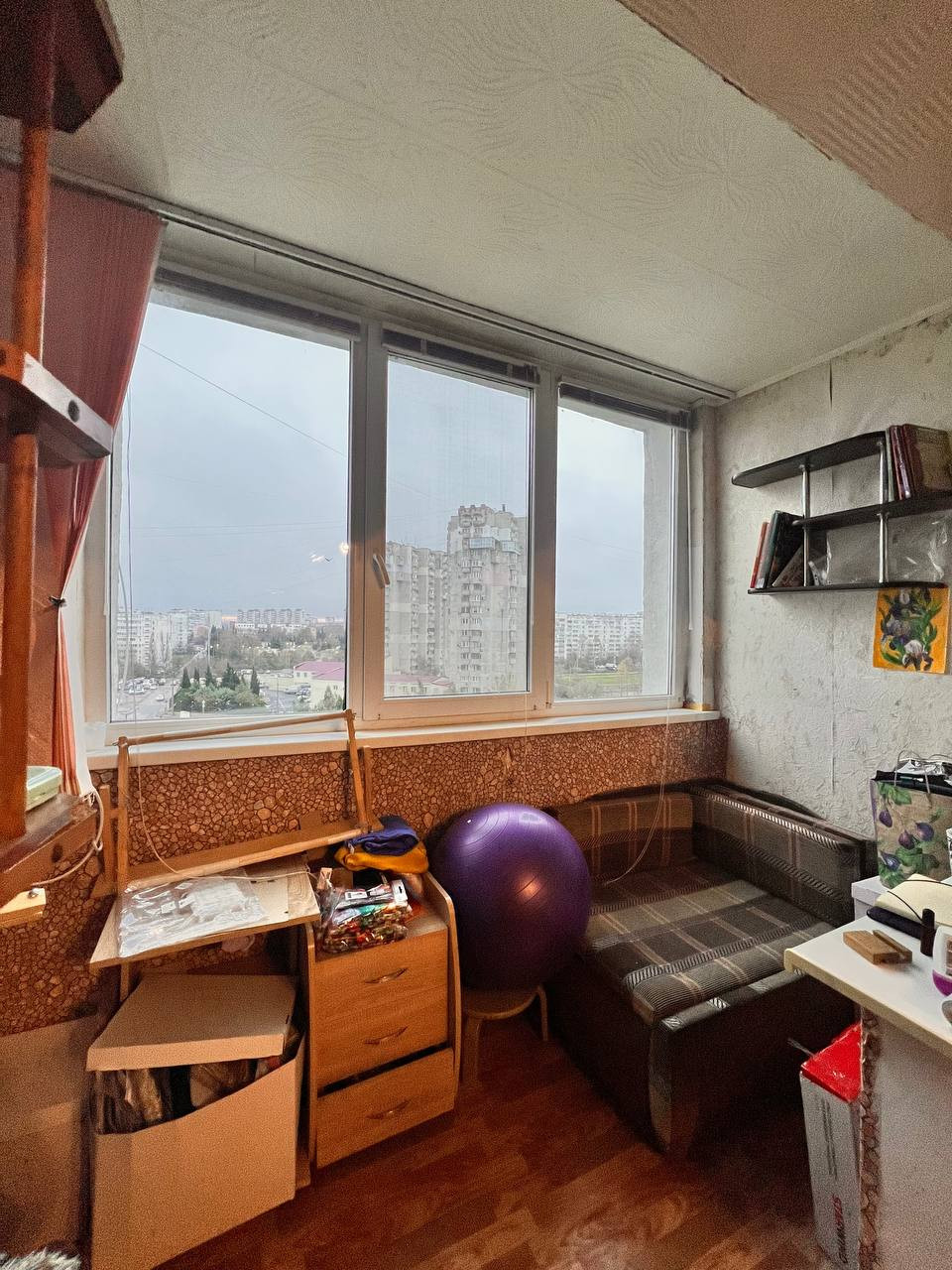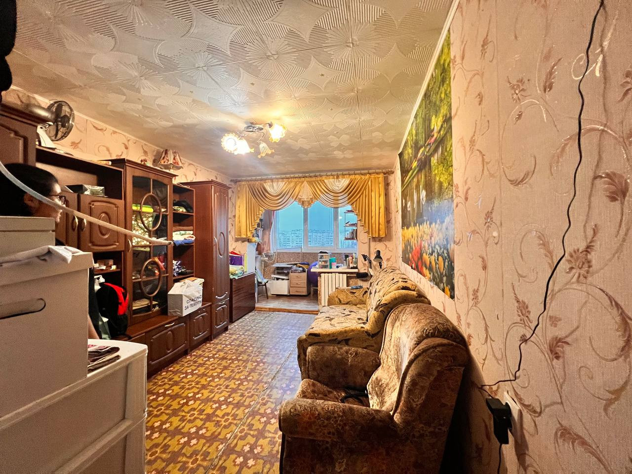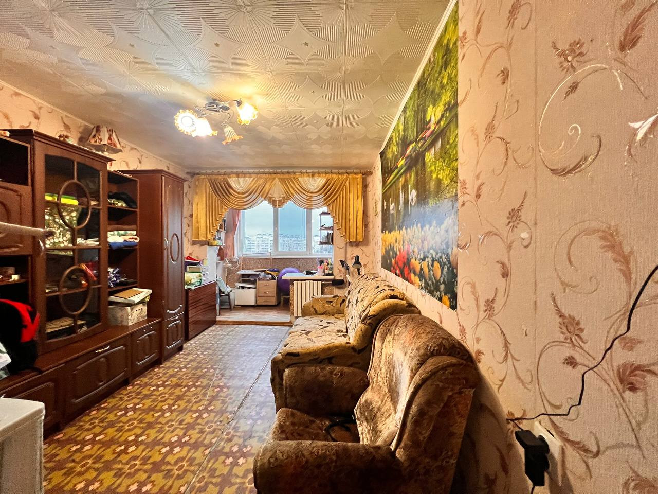 Есть: кухонный гарнитур, вытяжка, холодильник, стол, табуретки, стиральную машину приобретем, полутороспальный диван, кресло, большой шкаф-купе