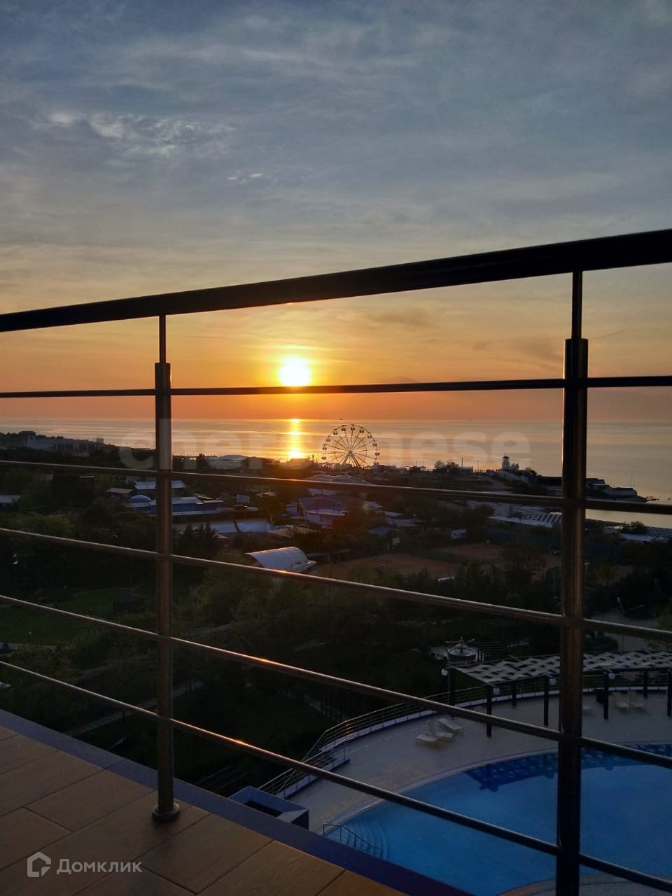 С балконом с видом на бассейн, закат, море.