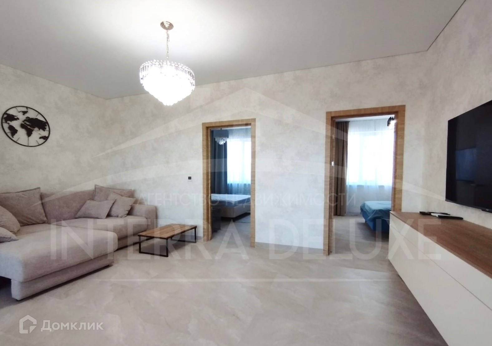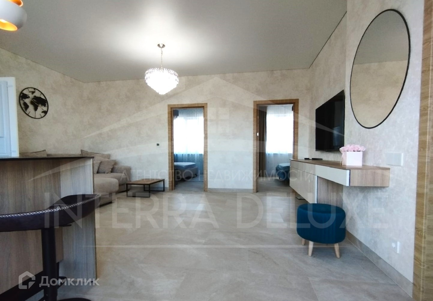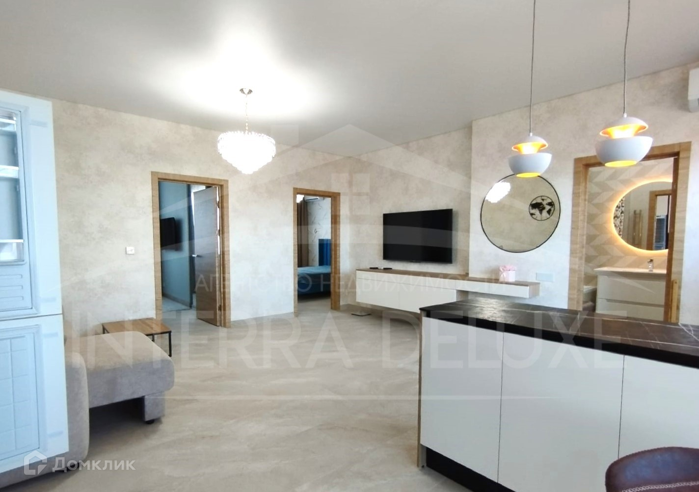 - Апартаменты оборудованы новой мебелью и современной техникой: 2 спальные кровати, диван, рабочее место, гардеробная, 2 шкафа-купе, 3 телевизора, духовой шкаф, варочная панель, вытяжка, холодильник, микроволновая печь, фильтр очистки воды, посудомоечная машина, электрочайник, барная стойка