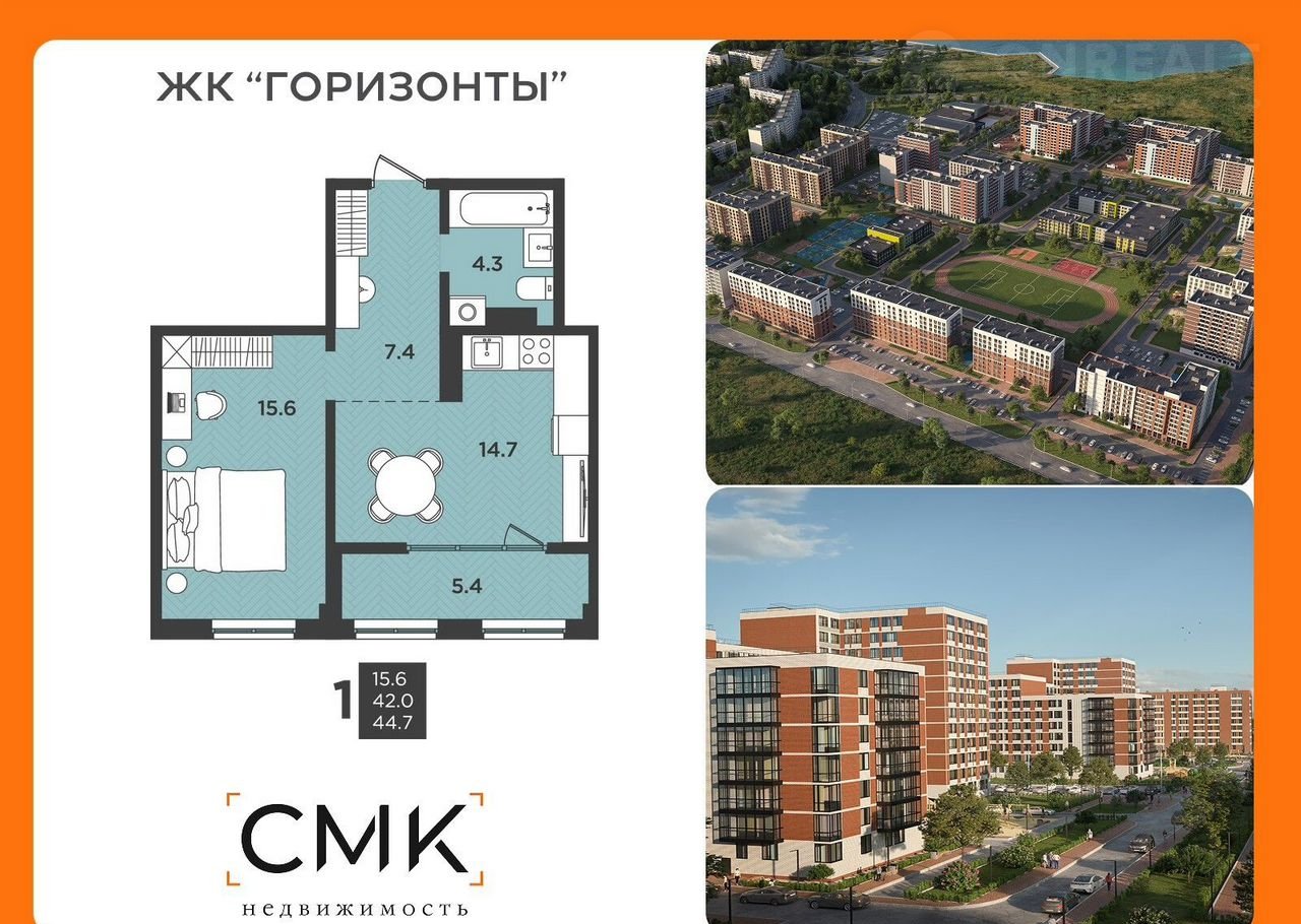 2-комнатная квартира, 44.7 м2, этаж 3 / 12, на продажу в Северодвинске