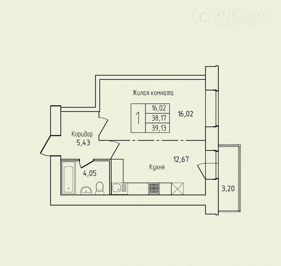 Пoлноцeнная однокoмнaтная квapтирa на 12 этаже площaдью 39,13 кв.м.
