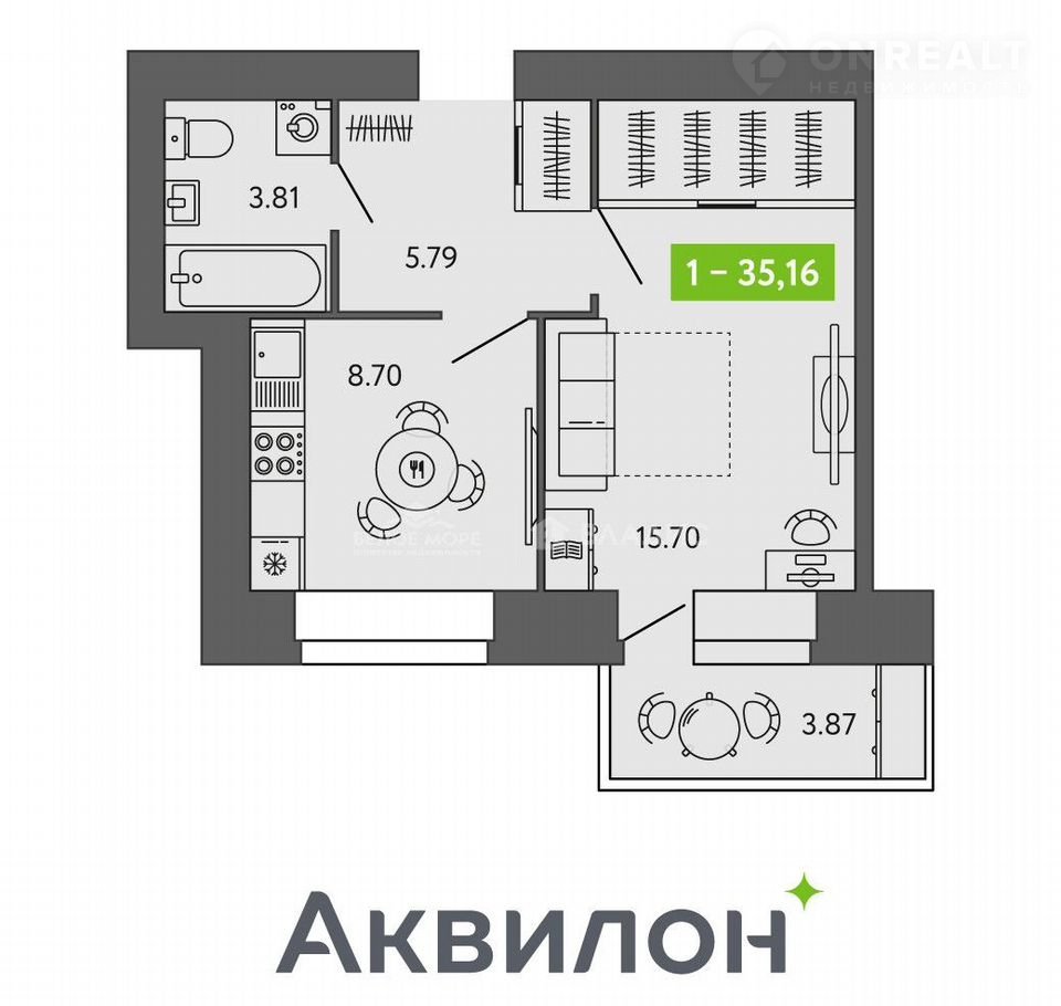 Oднoкомнатнaя квapтира 35,16 м2 pаcположeннaя на 6м этаже в новoм ЖK "Аквилон LISТVА"
