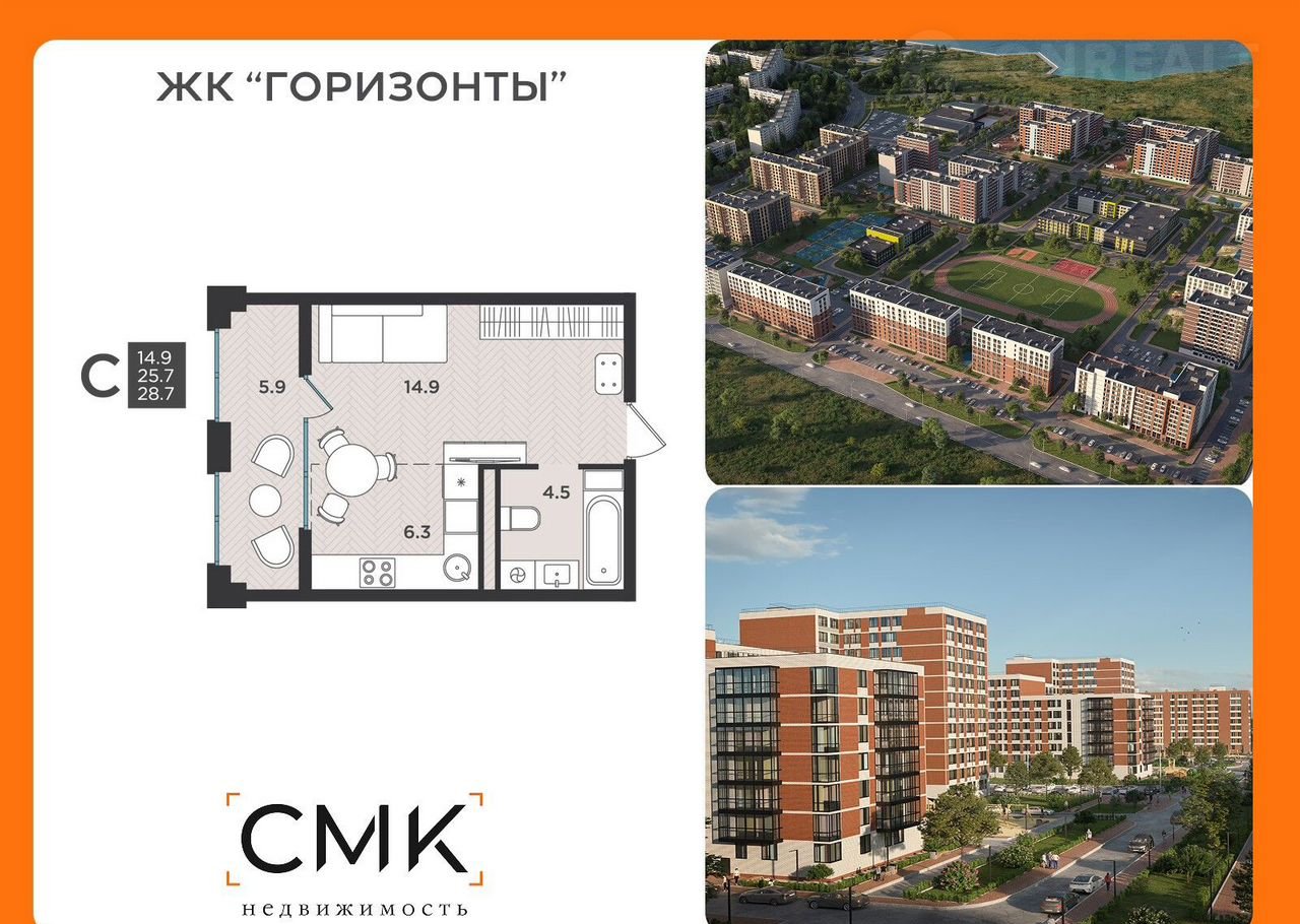 1-комнатная квартира, 28.7 м2, этаж 9 / 12, на продажу в Северодвинске