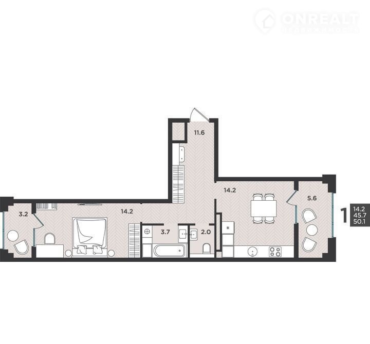1-комнатная квартира, 50.1 м2, этаж 7 / 12, на продажу в Северодвинске