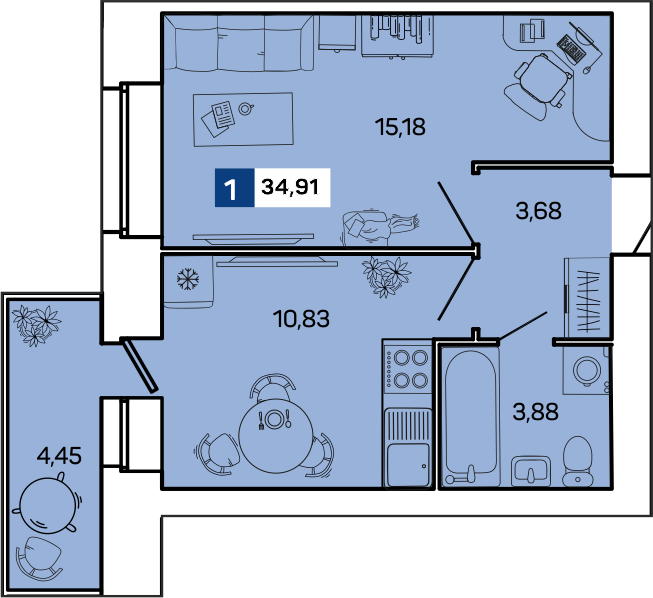 Общая площадь 34.9 м2