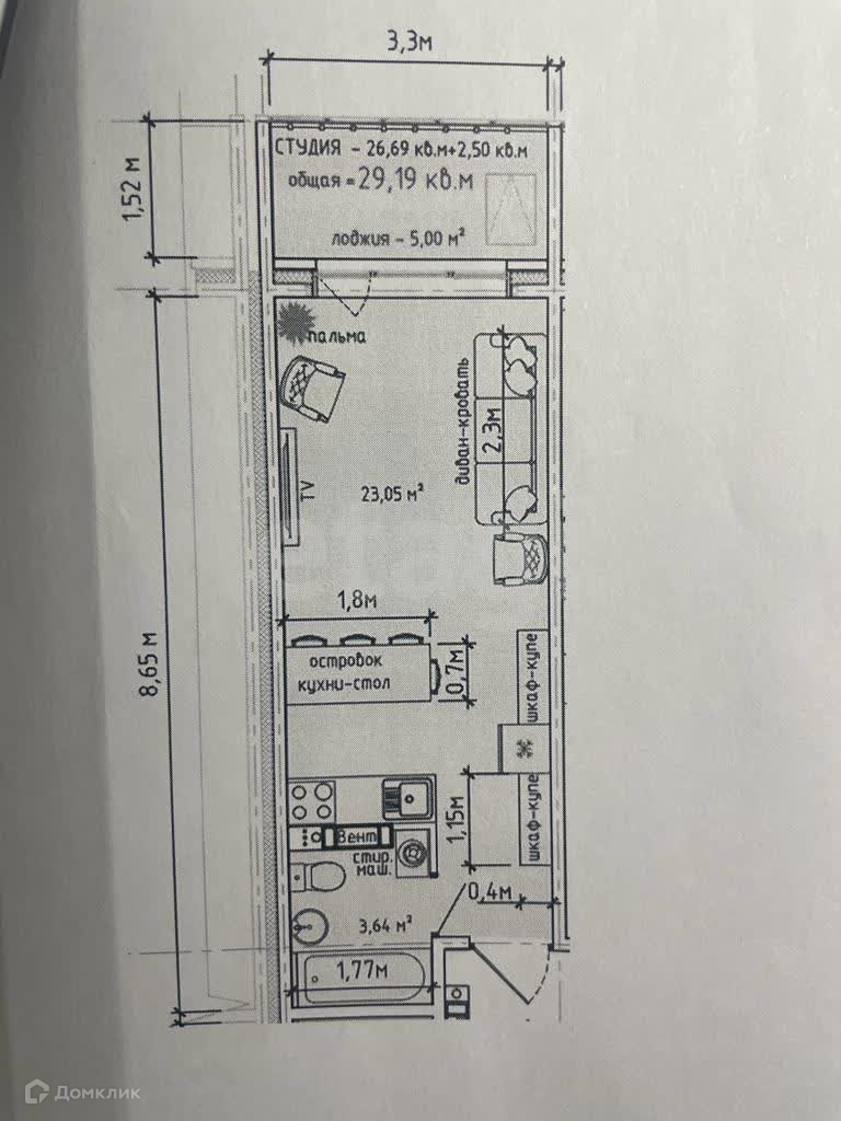Площадь 26,7 м2, с учетом лоджии 29,2 м2.