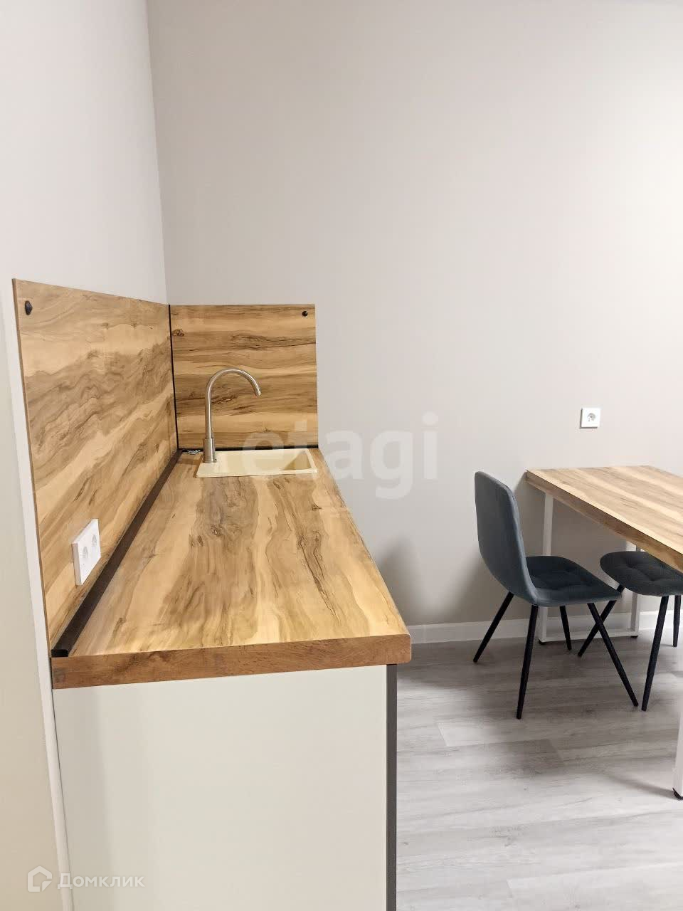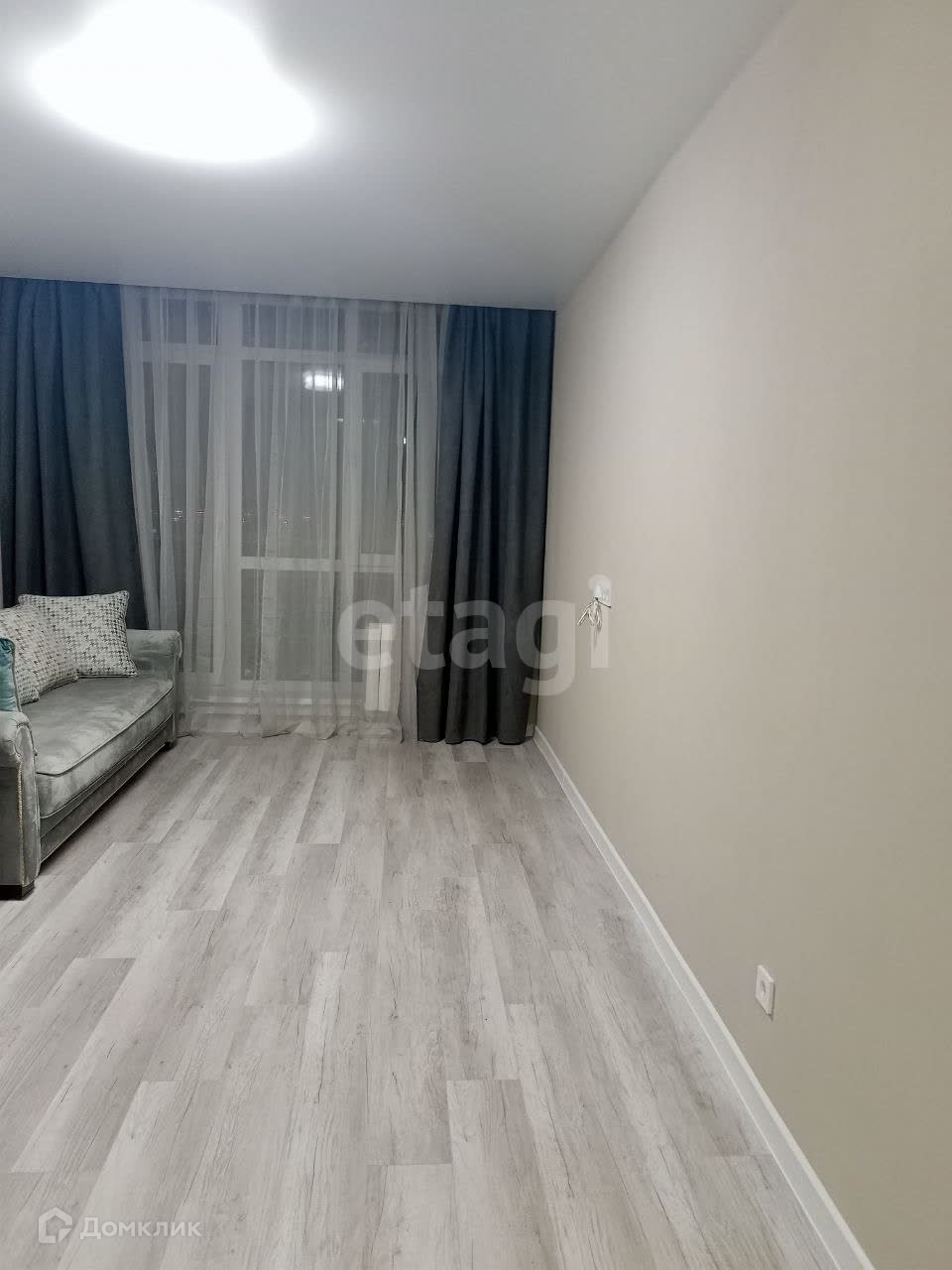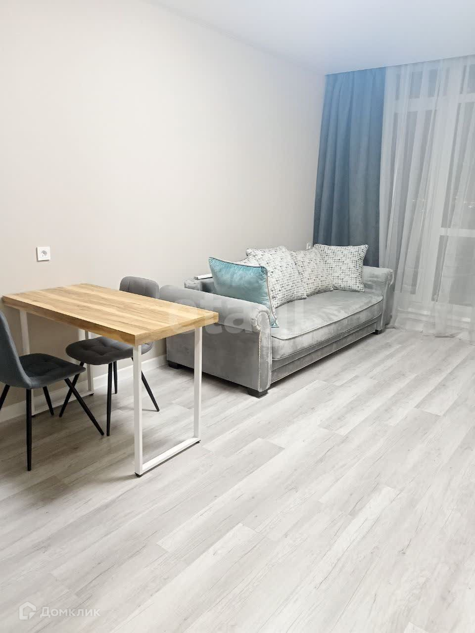 Уже имеется кухонный гарнитур, современный ремонт в ванной комнате, мебель, повешены шторы.
