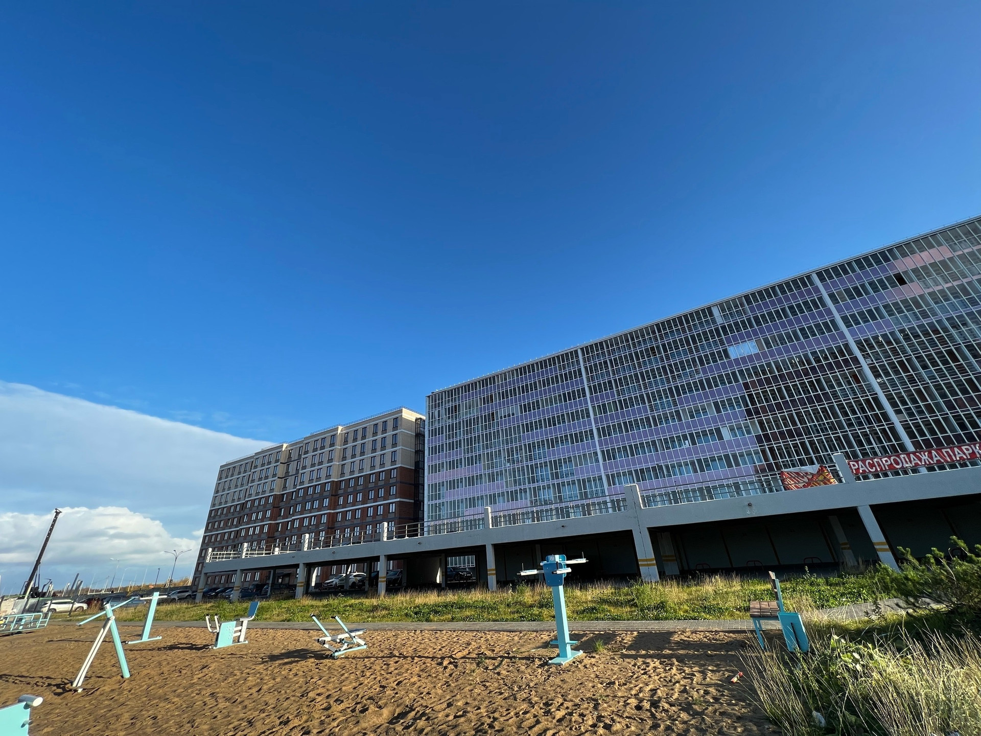 Во дворе уже установлена детская площадка, а также сделана парковка.