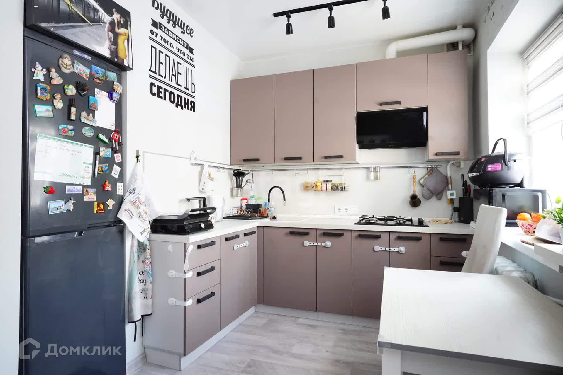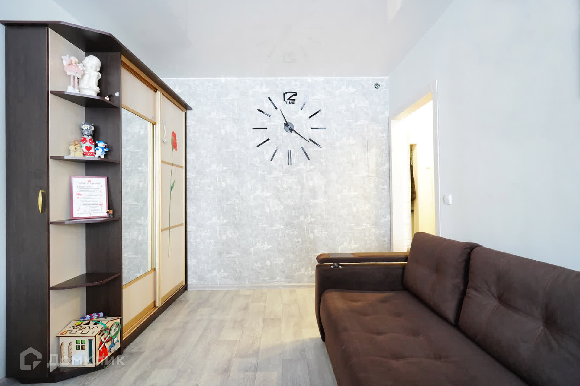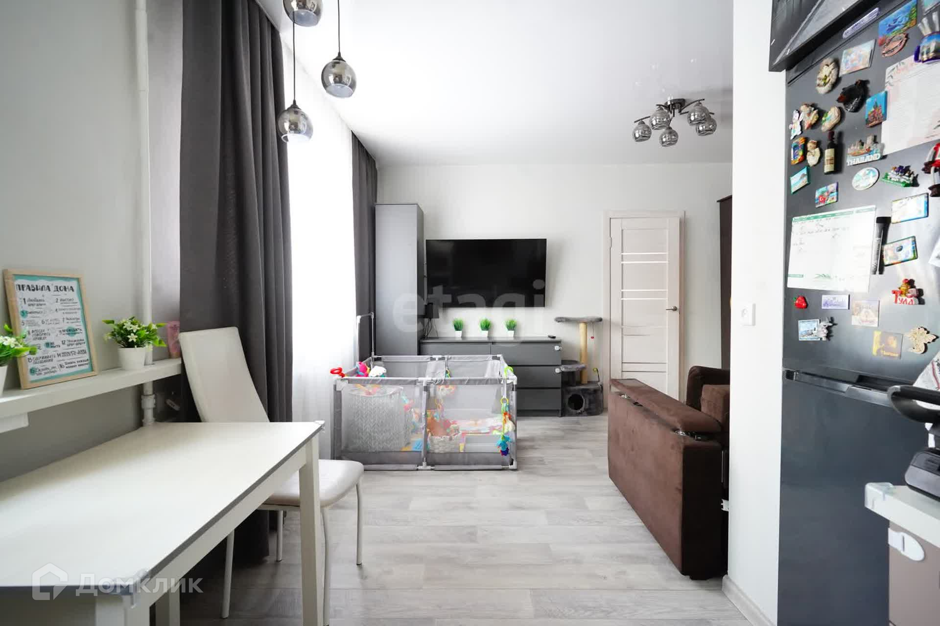В квартире выполнен современный ремонт, кухня и гостиная объединены в общее пространство, где могут собраться все члены семьи и гости. Отдельная спальня для детей с гардеробной.