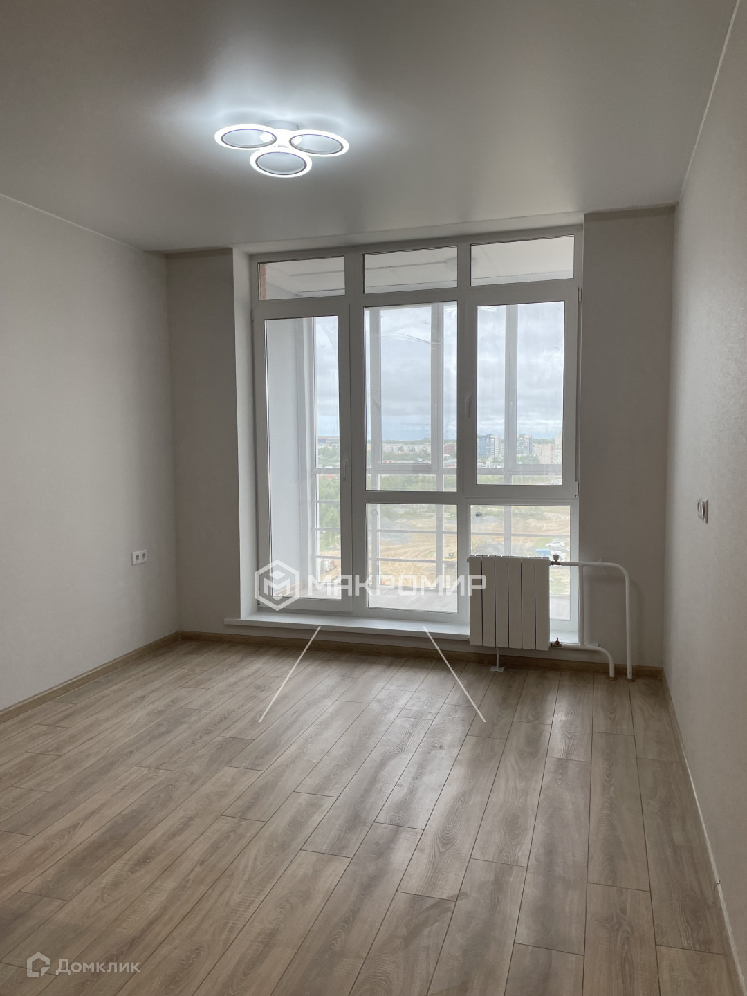 Большая застекленная лоджия с панорамным остеклением, откуда открывается прекрасный вид на  город.