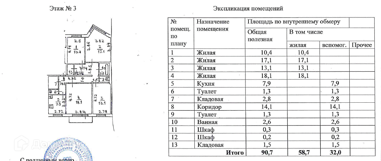 Общая площадь 90.7 м2. Просторные комнаты 18.1, 17.1, 13.1 и 10.4 м2. Кухня 8.9м2.