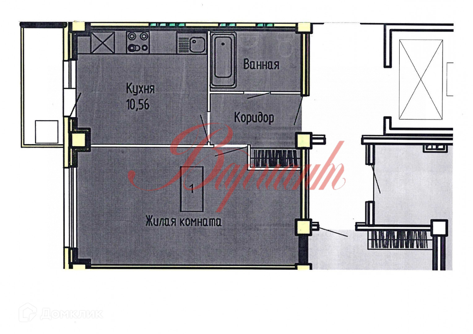 В прямой продаже большая 1-комнатная квартира.