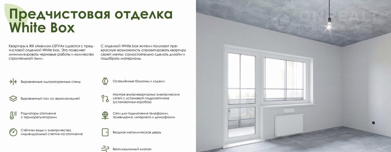 — Отделка Whitе bох: ровные стены и пол, электрика и сантехника разведены по точкам, установлен счетчик. Идеальная база для вашего дизайна или быстрого запуска в аренду.