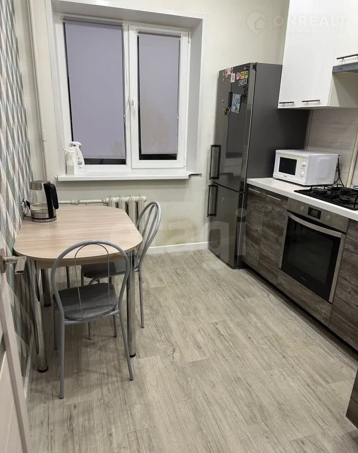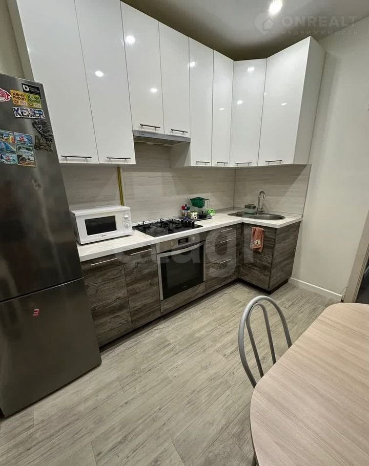Кухня — просторная и светлая, с кухонным гарнитуром, обеденным столом и стульями, холодильником, духовым шкафом.