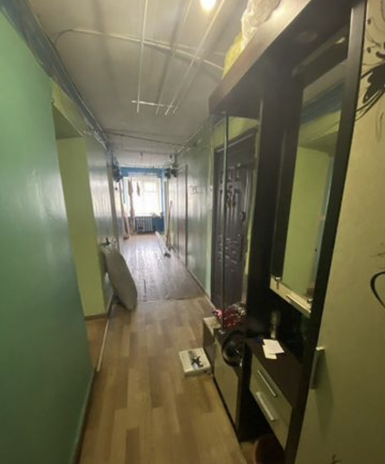 В комнате есть диван, шкаф, стол и стулья, холодильник, стиральная машинка. Из соседей живет один мужчина, остальные комнаты пустуют.