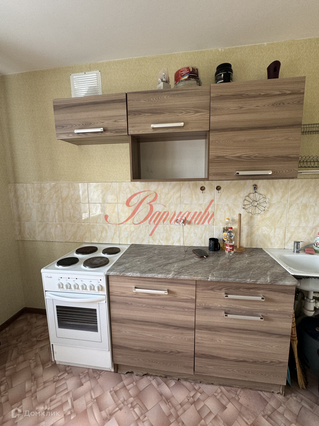 Имеется все необходимое для проживания: диван, стенка в комнате,  кухонная мебель, холодильник,  плита, электрический чайник.