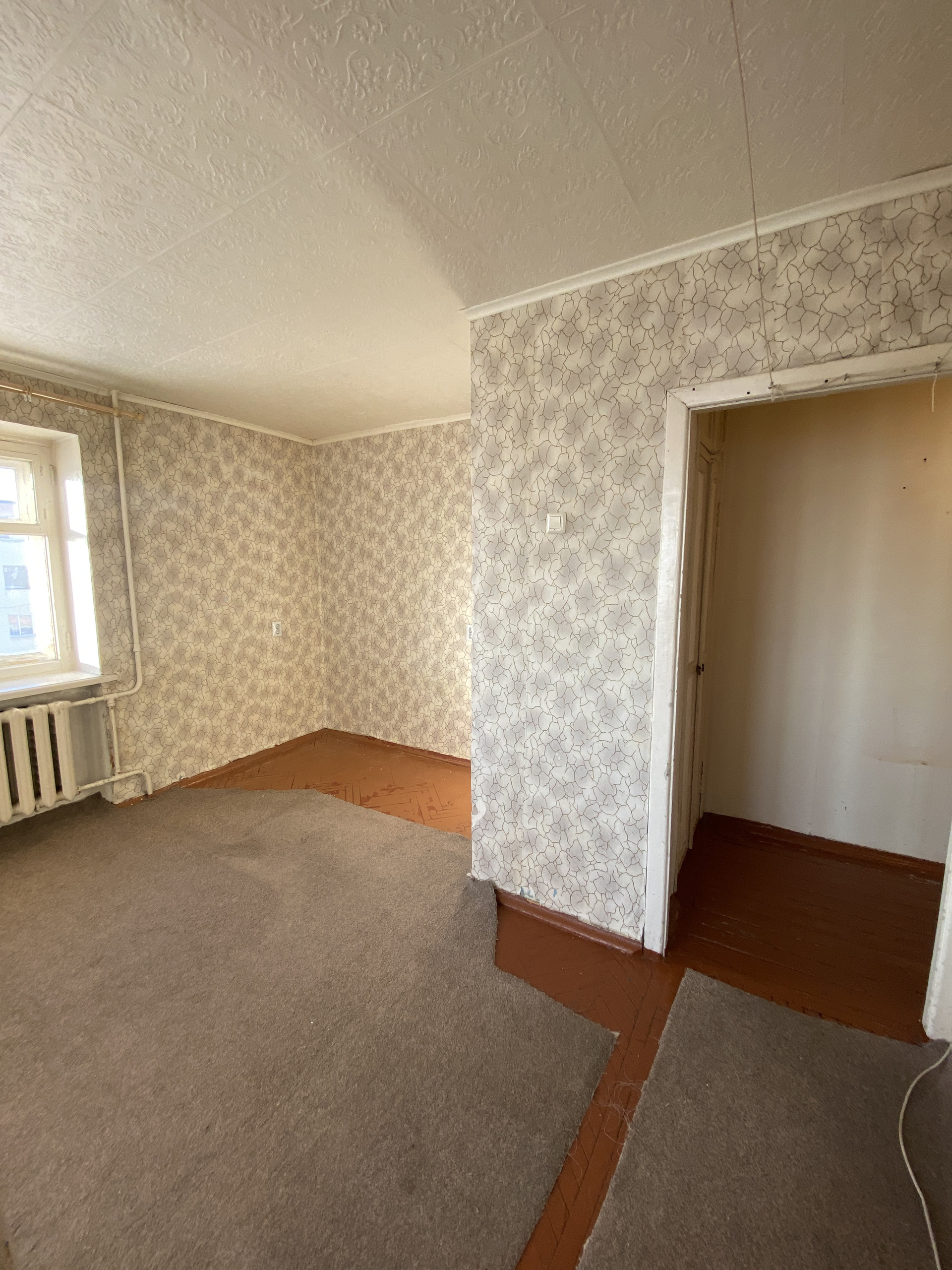 Комната : площадь 17.7 кв.м, стены - обои, напольное покрытие доска, исполнение потолка – плитка.