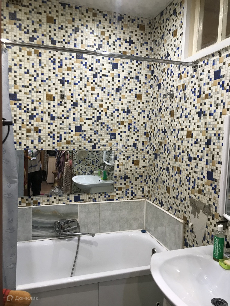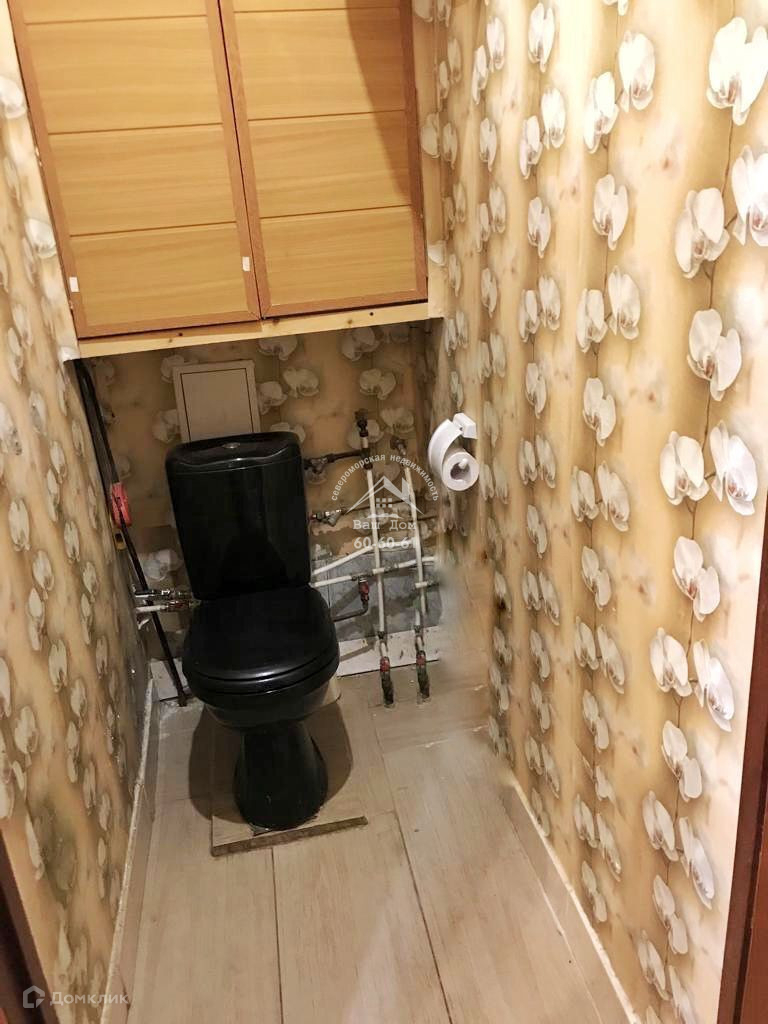 - ванная комната частично выложена плиткой, частично оклеена обоями, туалет - обоями