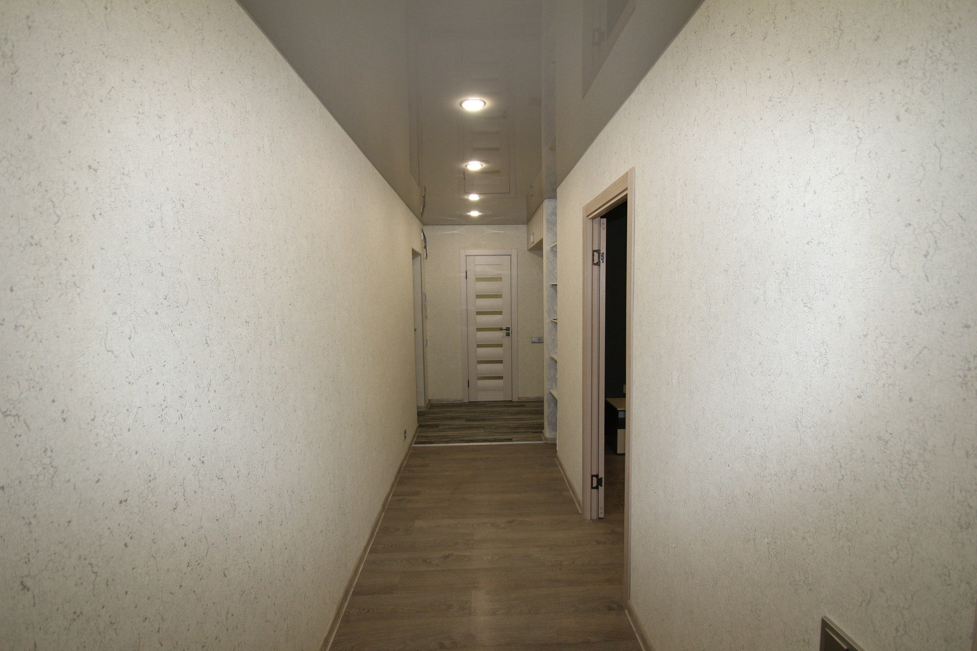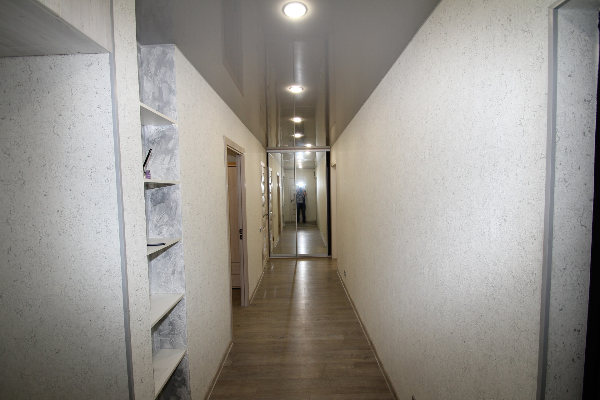 Во всех комнатах уложен ламинат. В прихожей и на кухне - кафельная плитка с подогревом пола.