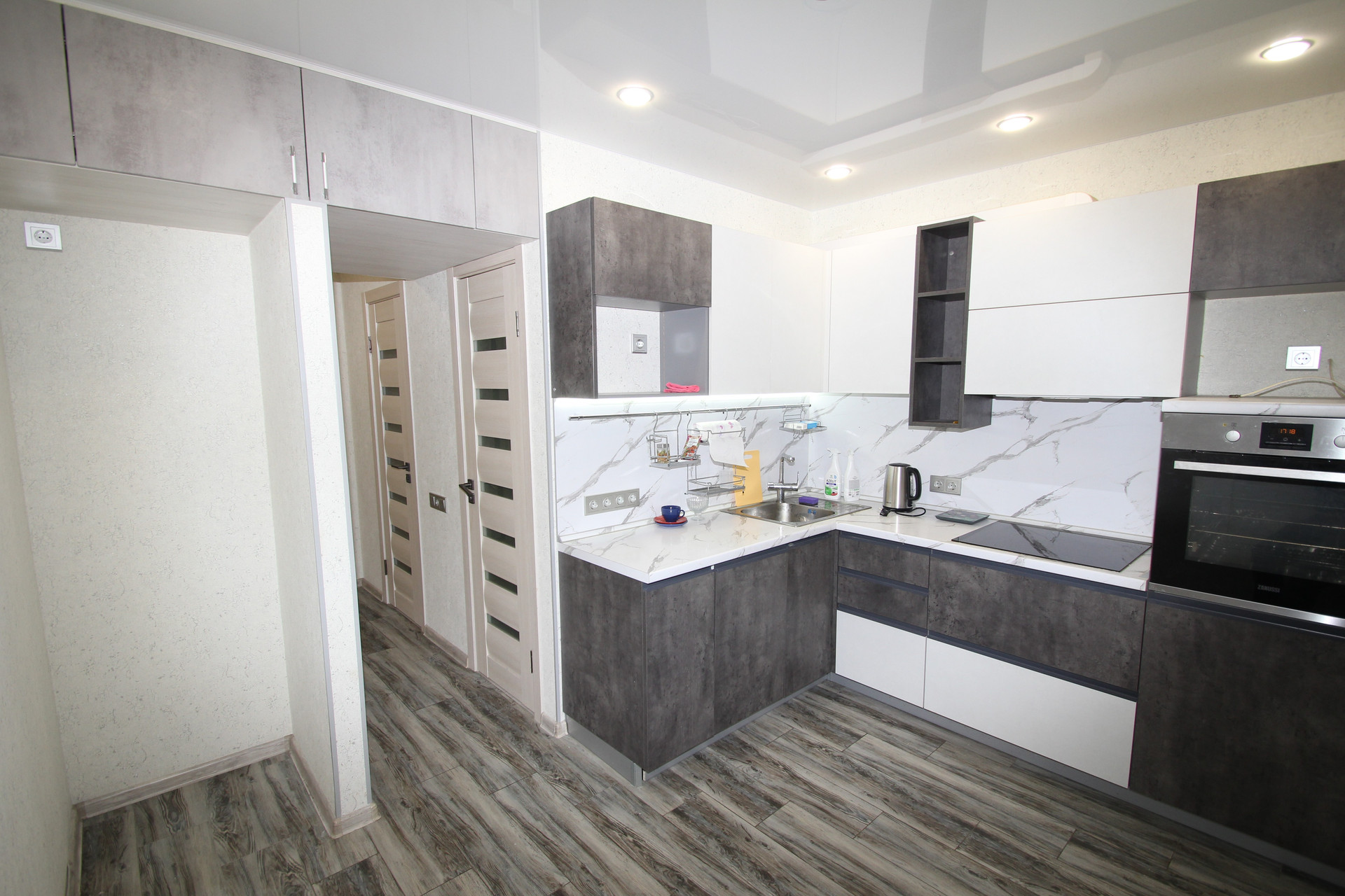 На кухне остается кухонный гарнитур и встроенная техника - варочная панель, электродуховка, вытяжка и посудомоечная машина. Все новое, в отличном состоянии.