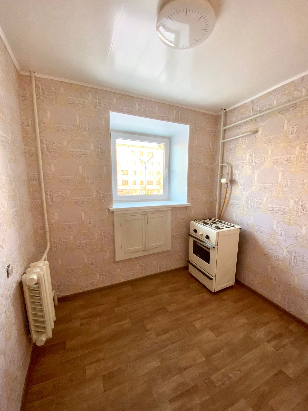 Кухня, 6.1 кв.м.: Установлен пластиковый стеклопакет, заменена межкомнатная дверь. Исполнение пола - линолеум, исполнение стен - обои, исполнение потолка - пластиковые панели.