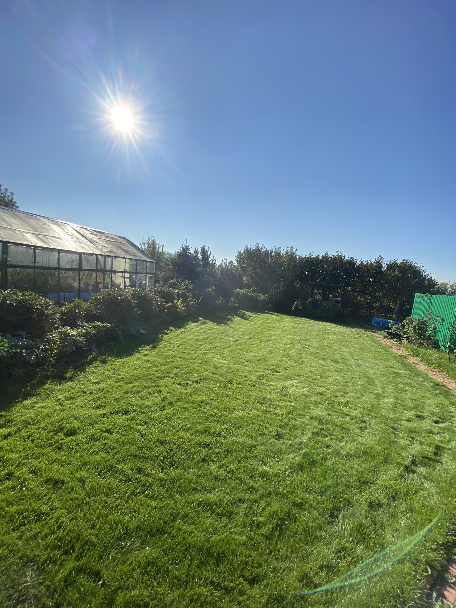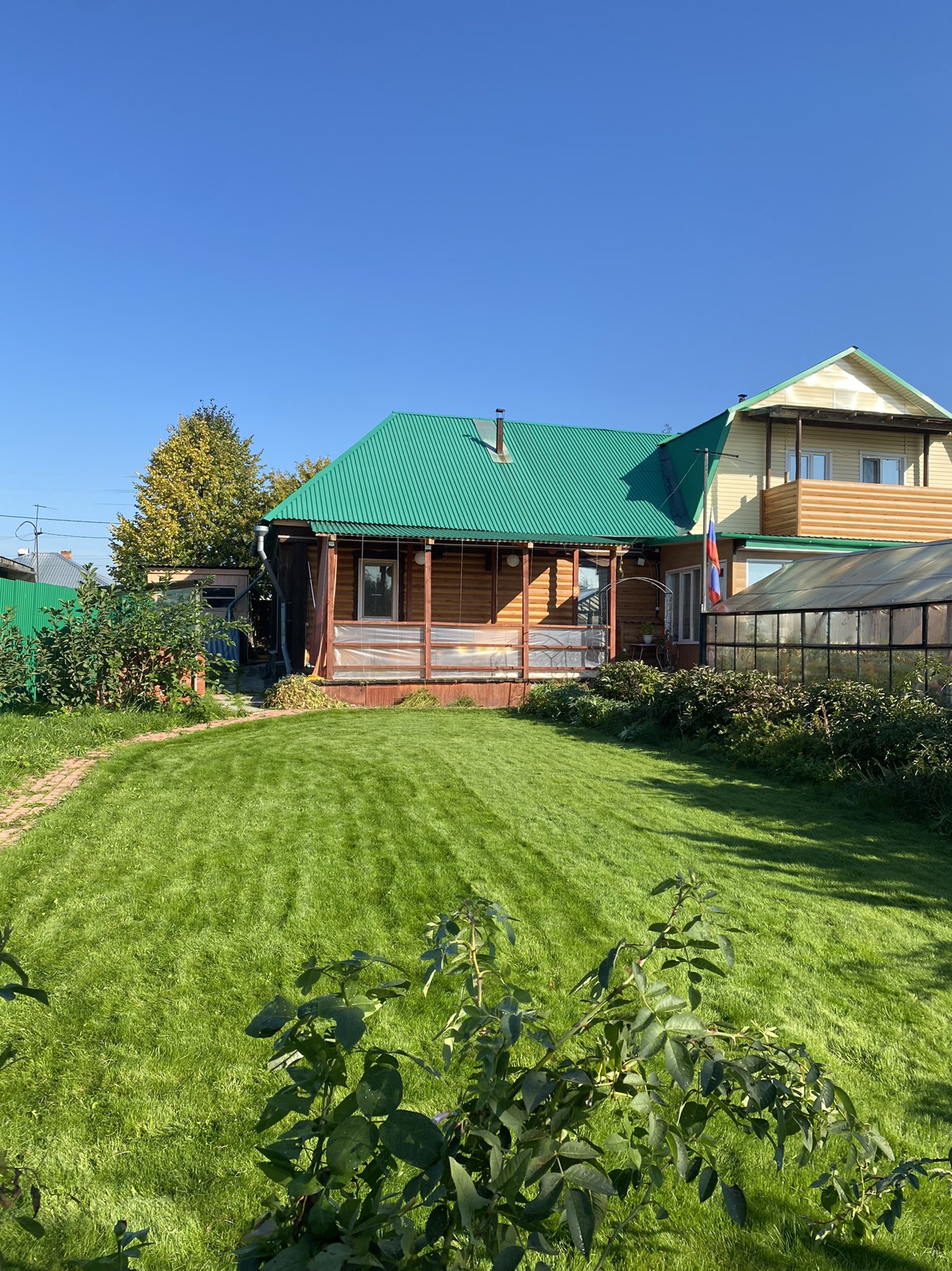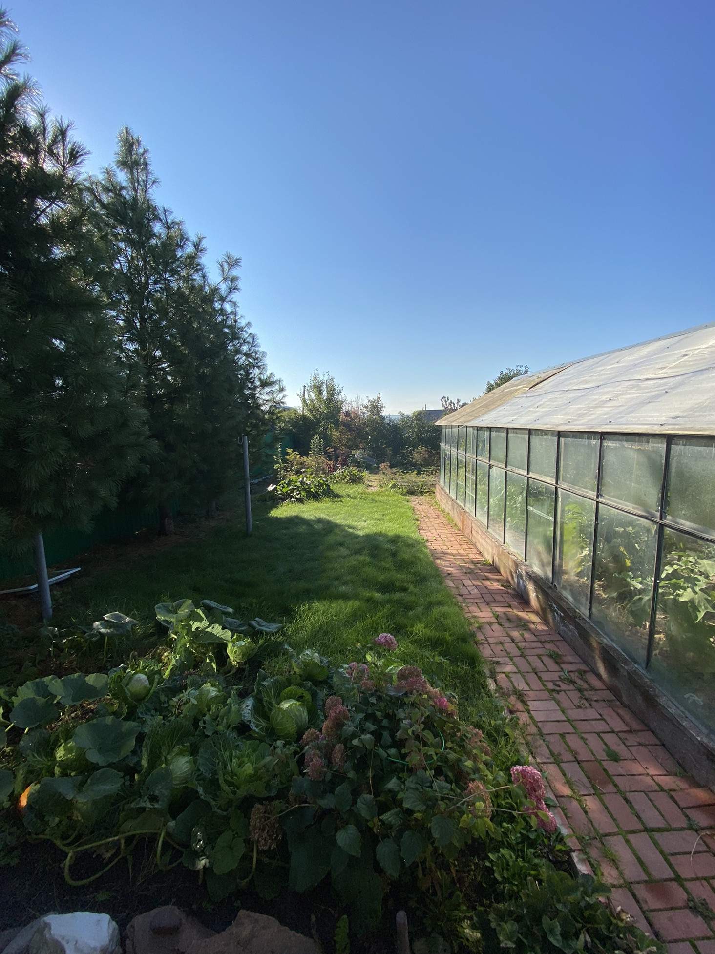 На участке плодовые насаждения, большая теплица