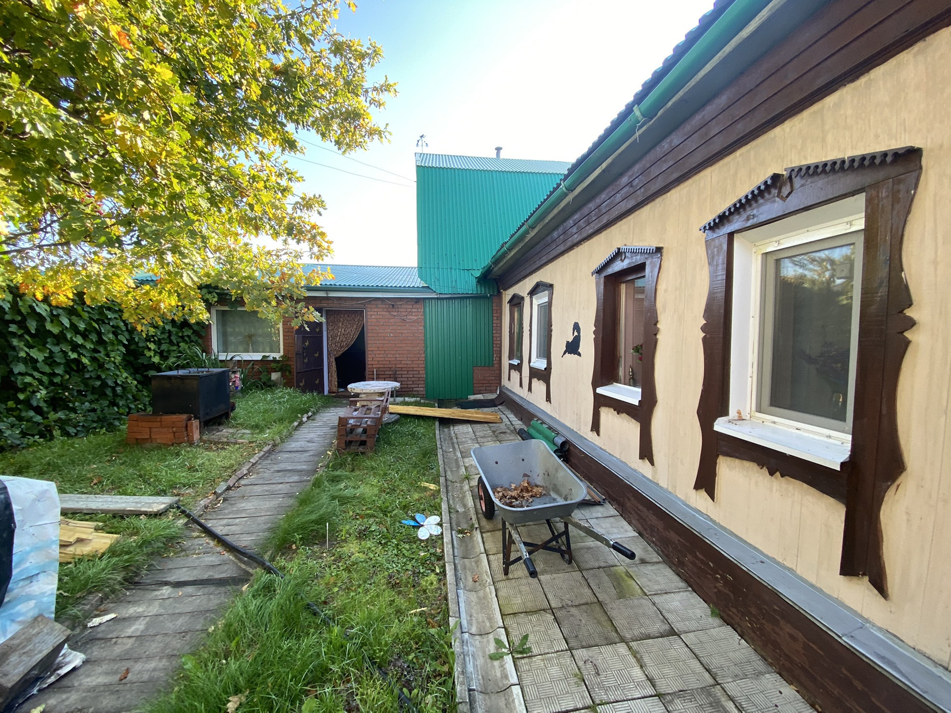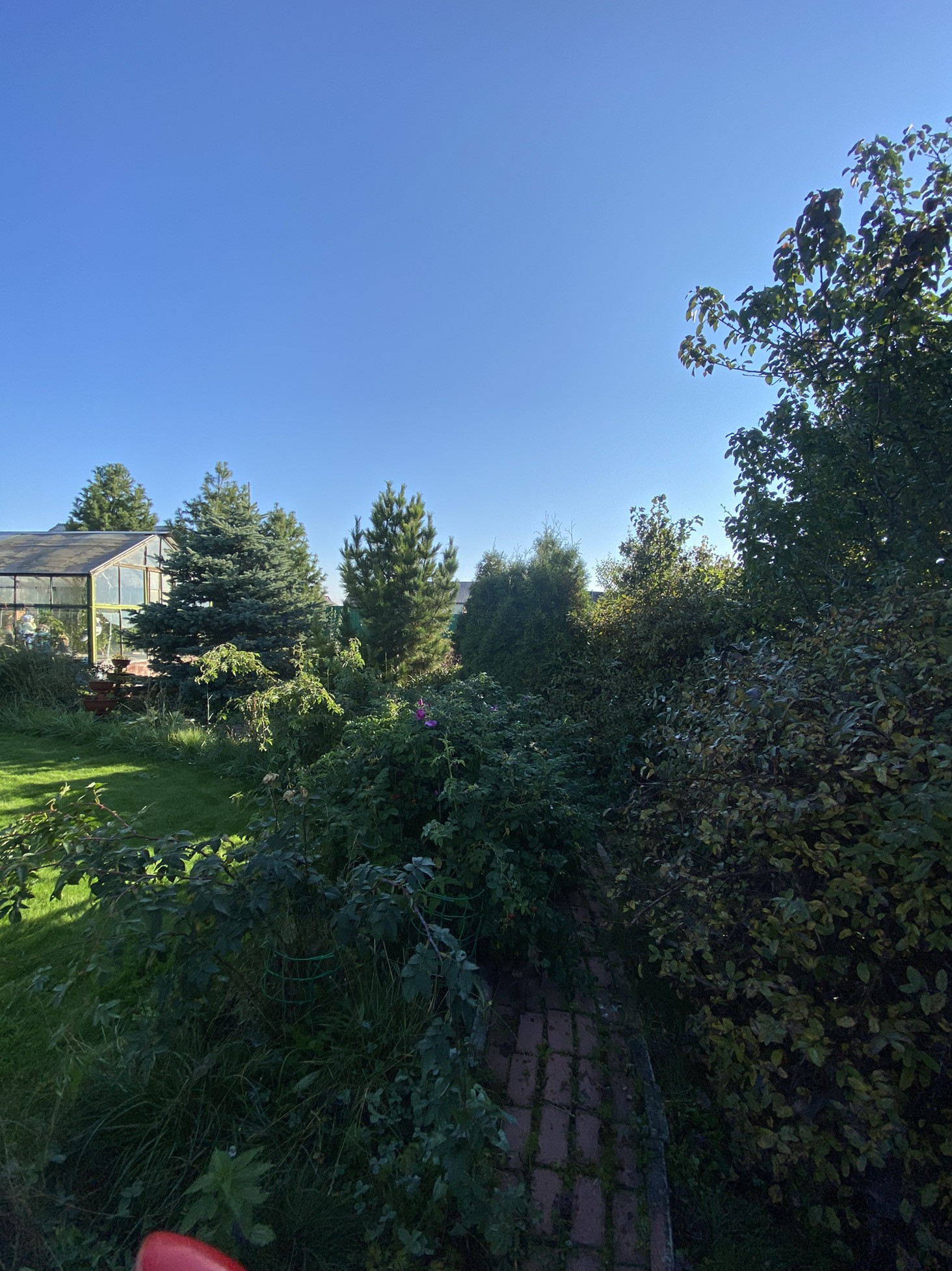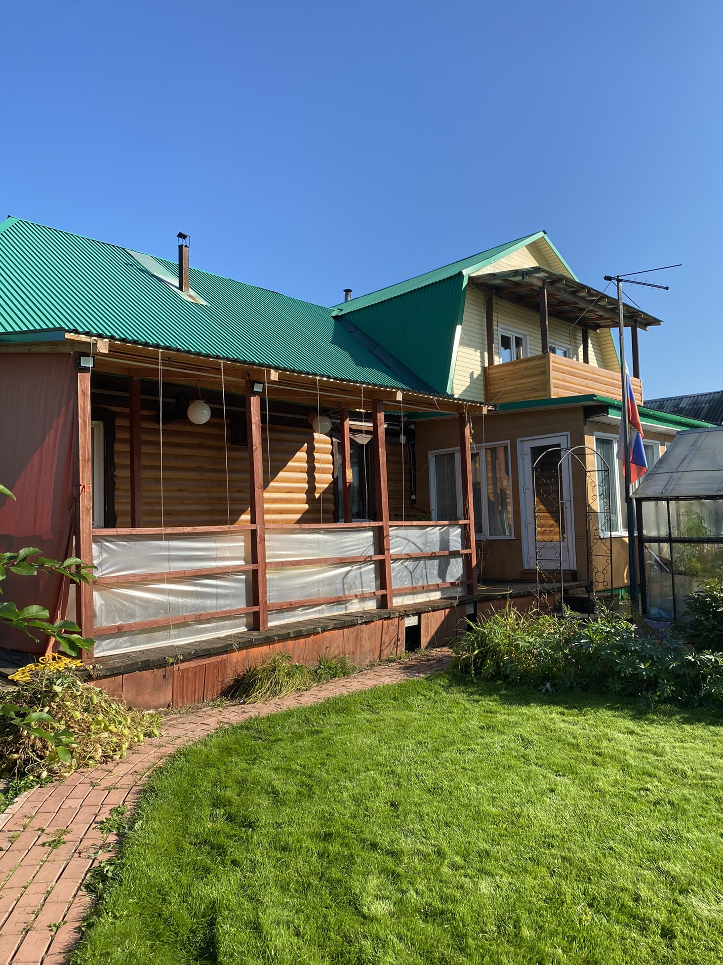 На участке плодовые насаждения, большая теплица