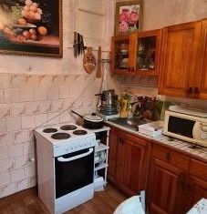 Окна деревянные, батареи чугунные. На полу ленолиум,. Сан.узел совмещенный, в кафеле. Дверь в сан.узел поменяна. Входная металлическая дверь нового образца.Остается кухонный гарнитур с плитой. |