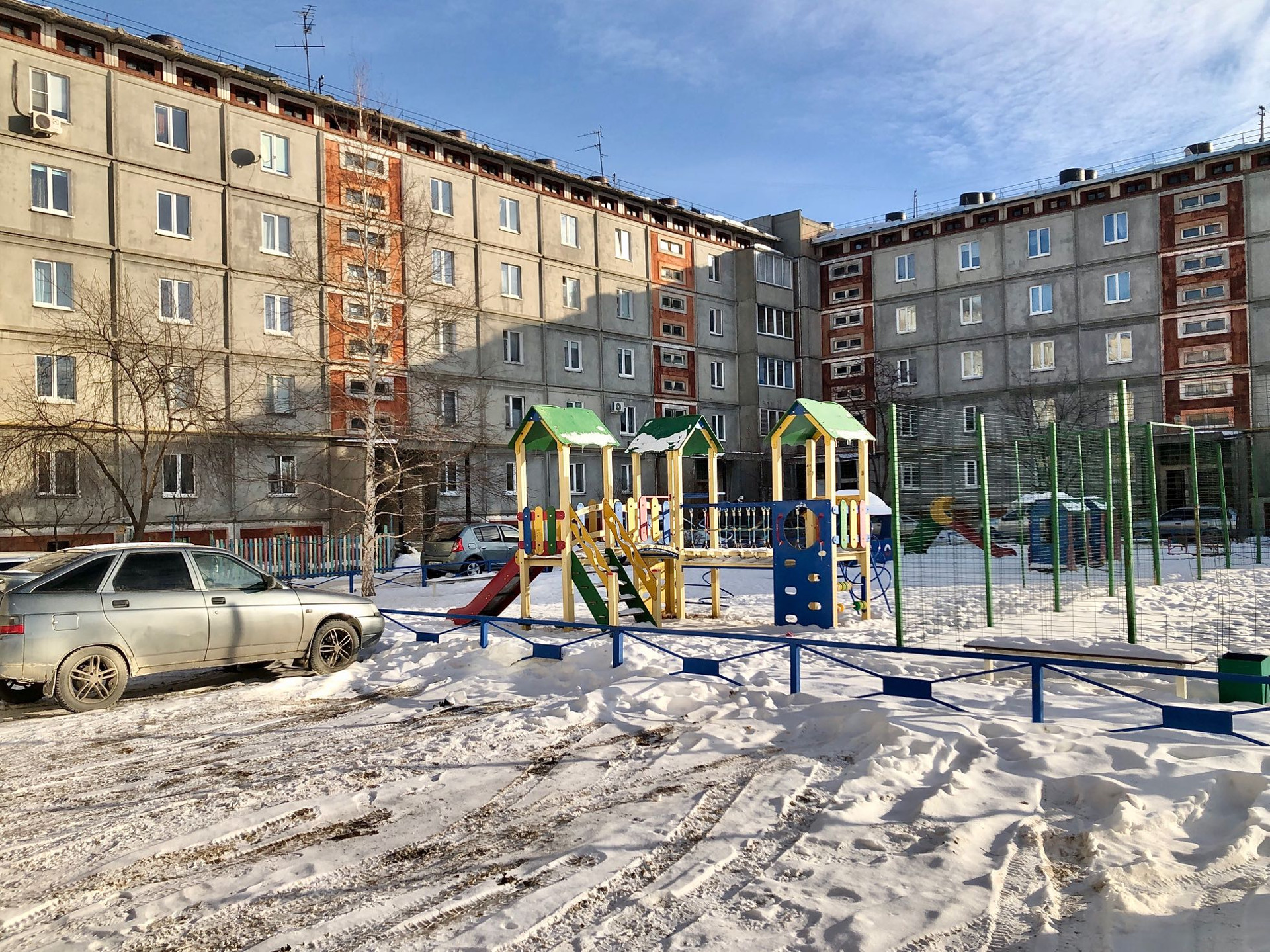 Дом многоподъездный, но очень дружный. Ухоженный большой двор с детской площадкой и местами для парковки автомобилей.