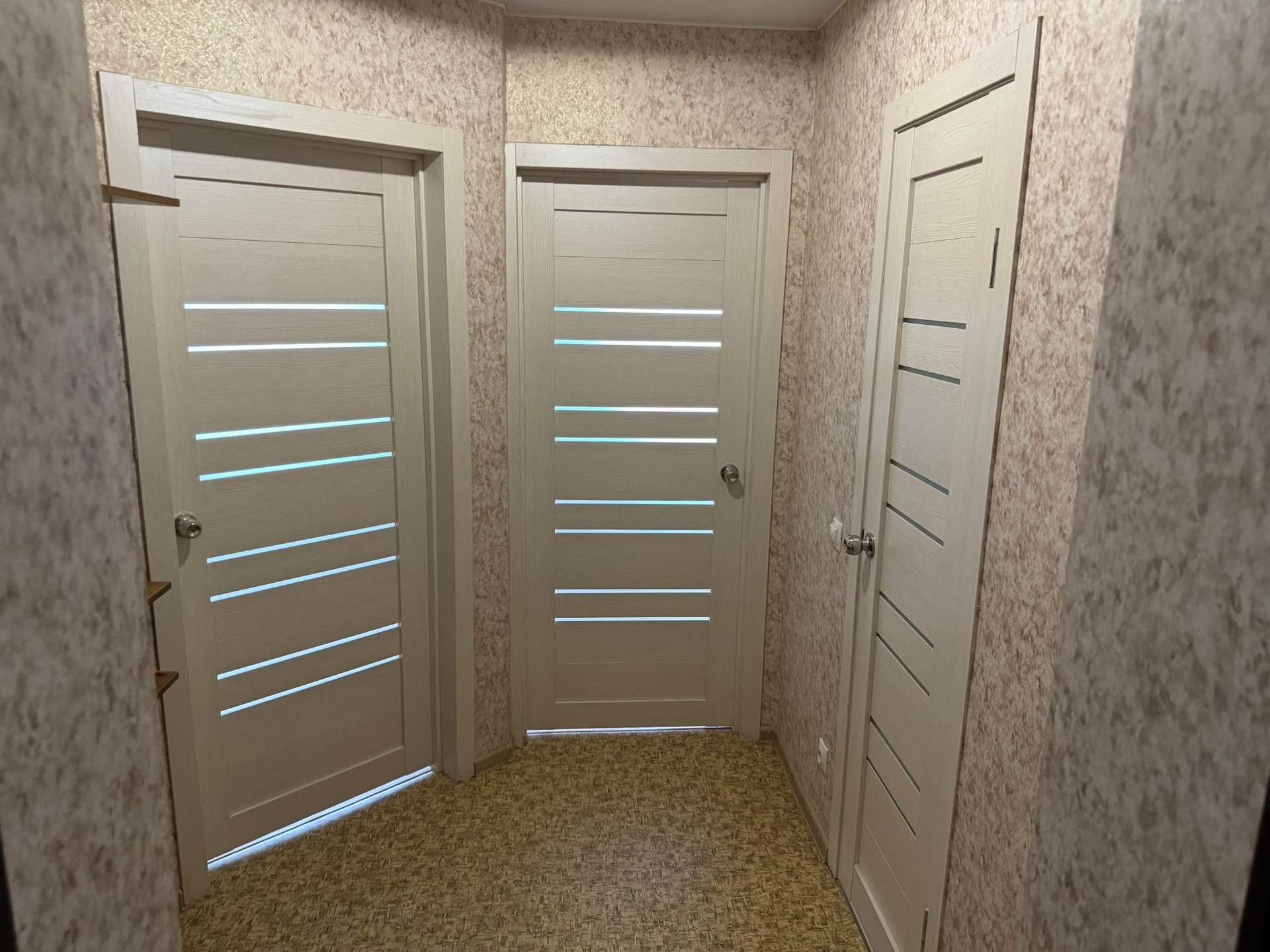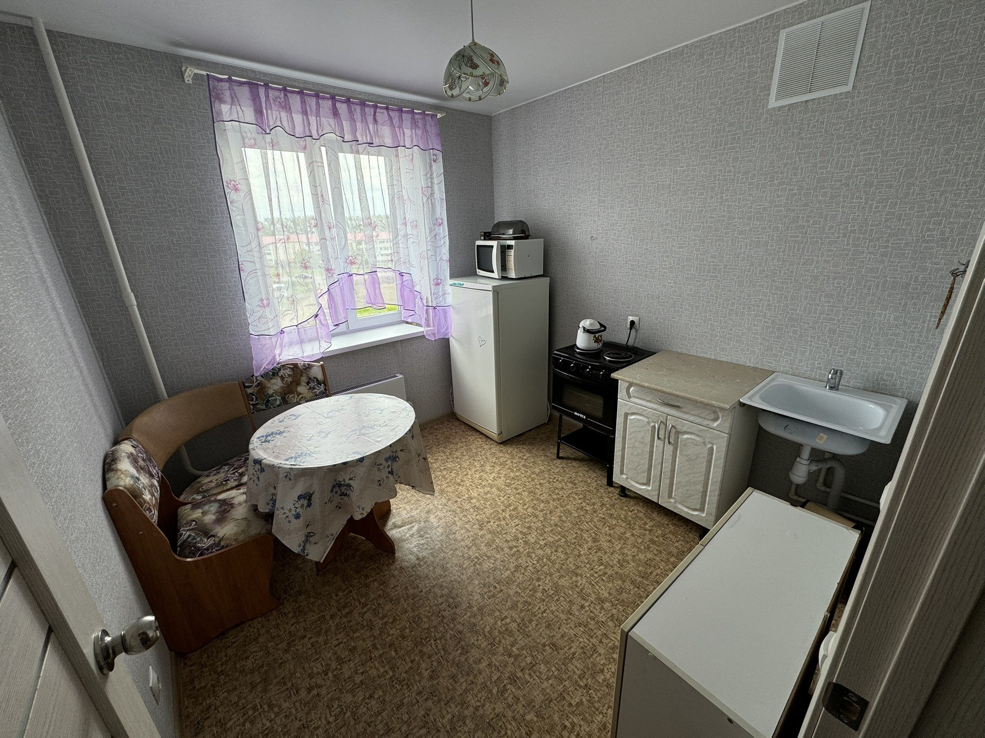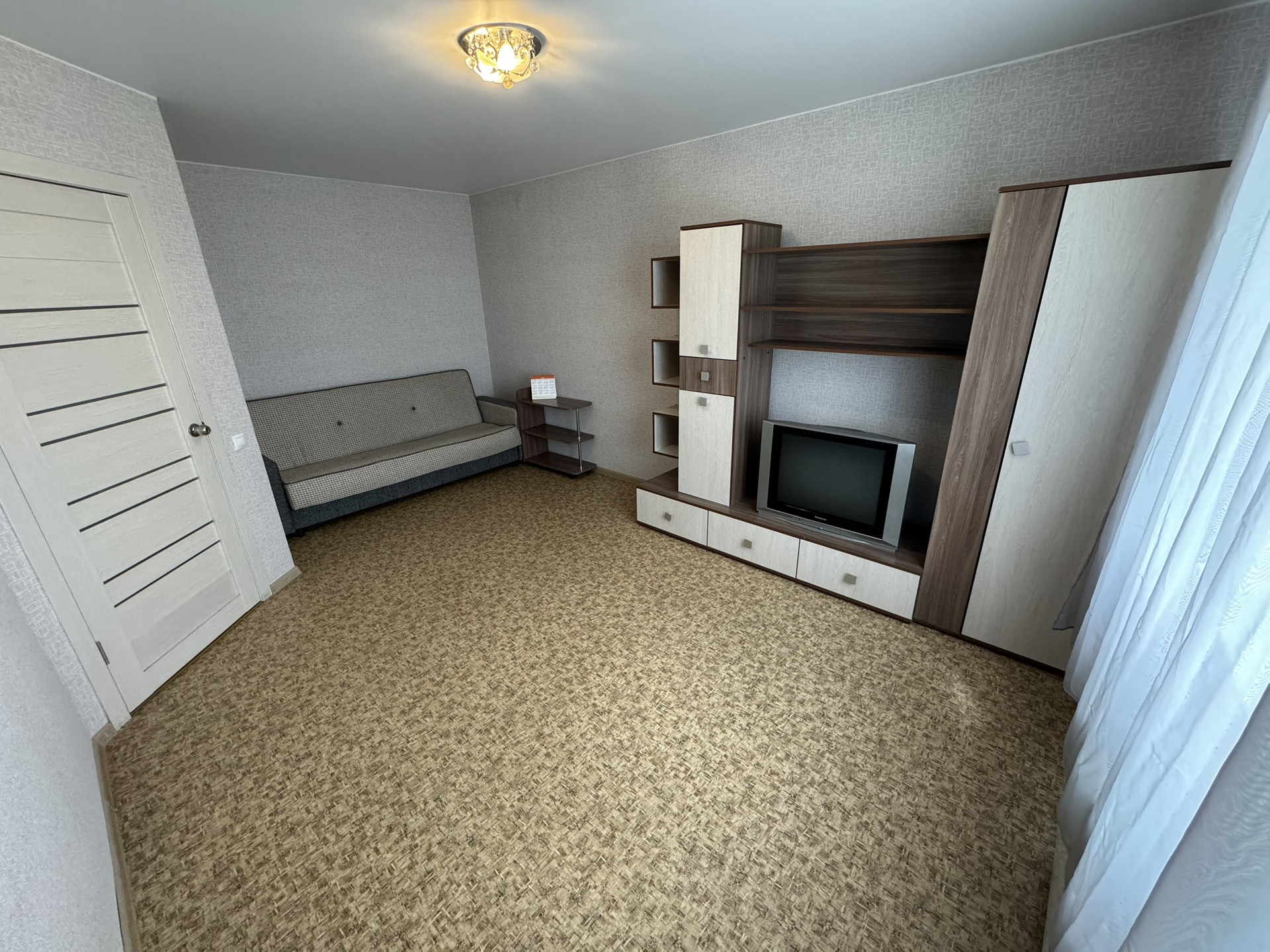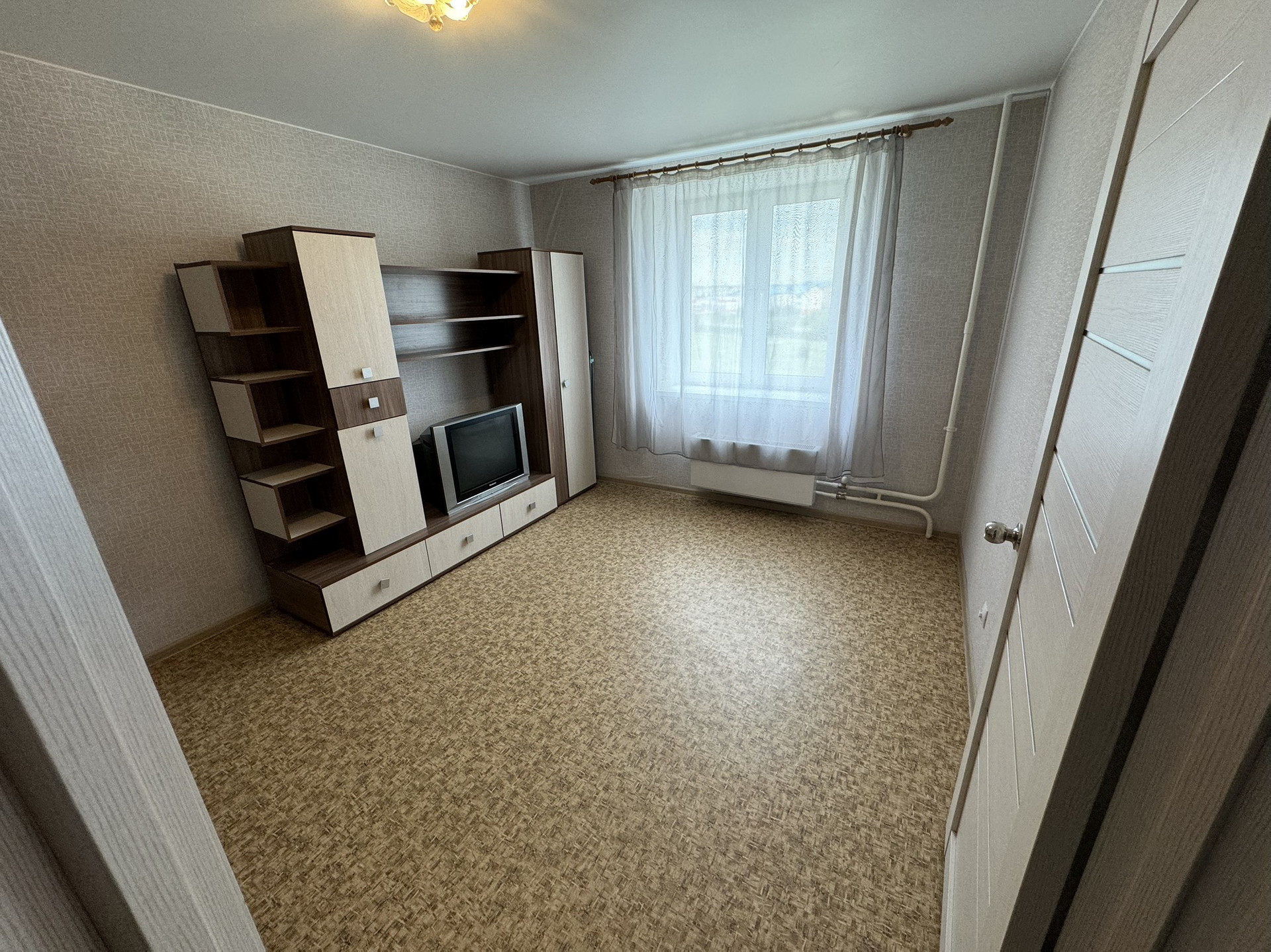 В квартире свежий ремонт от застройщика ( натяжные потолки, пластиковые окна, обои, линолеум, межкомнатные и входная дверь ).