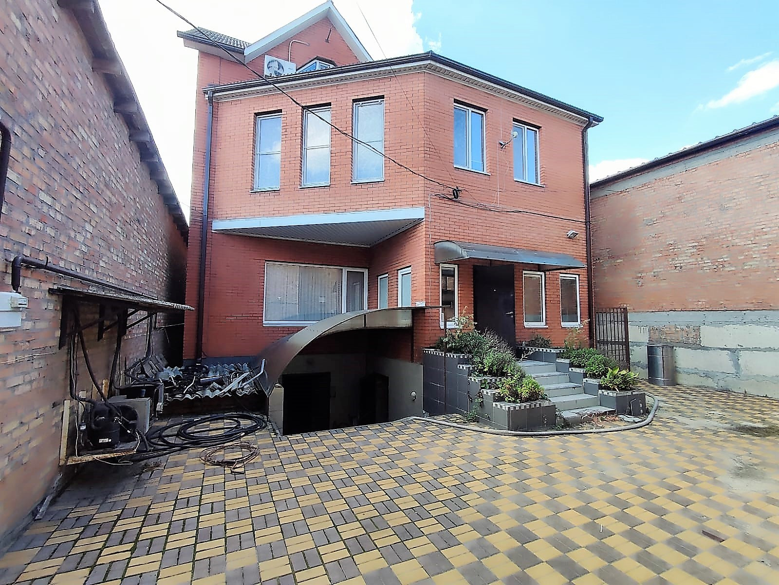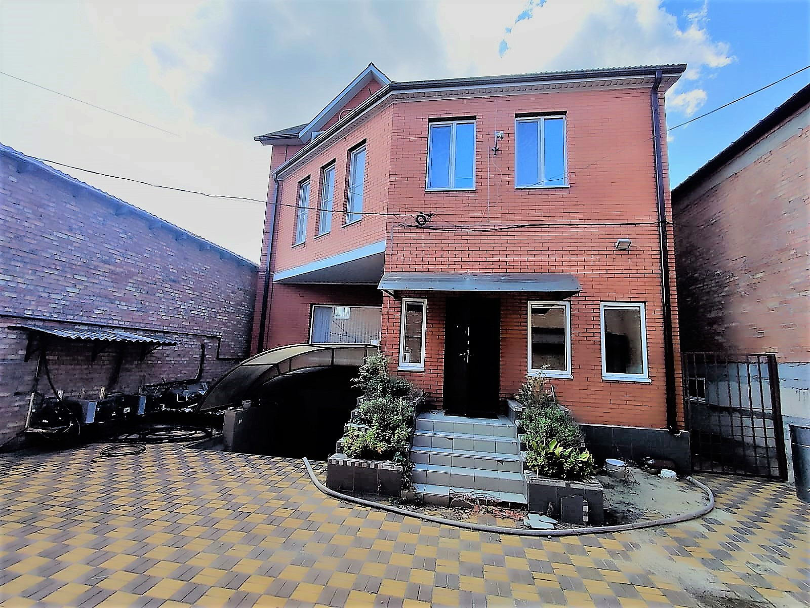 Участок 4 сотки (в собственности), есть заезд, территория для зоны отдыха. Мощение двора - плитка. Сад и огород отсутствуют.
