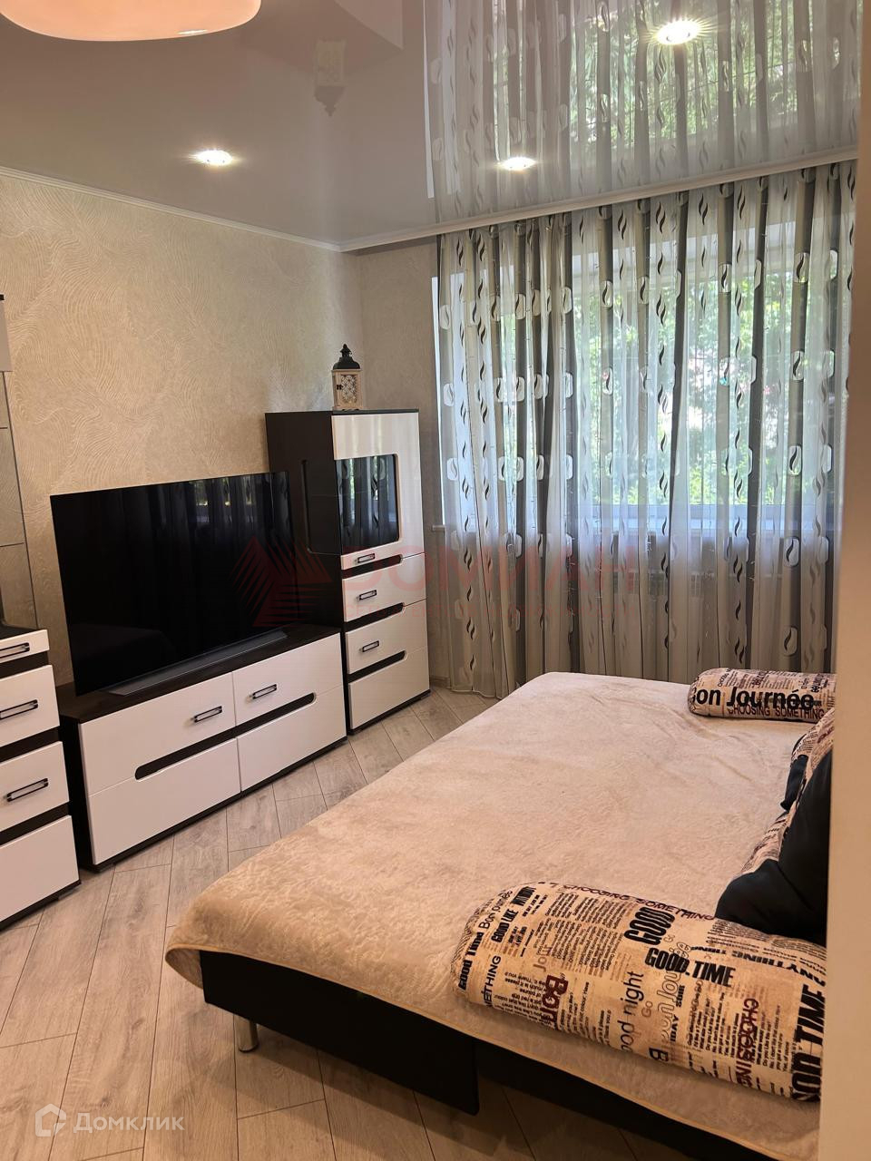 В гостинной представлен уютный уголок для отдыха, большой диван и телевизор. Интерьер дополняют стильные элементы декора и картины на стенах. Кухня оборудована всей необходимой бытовой техникой, имеет стильный обеденный стол и стулья. В спальне установлена удобная двухспальная кровать, шкаф для хранения вещей.