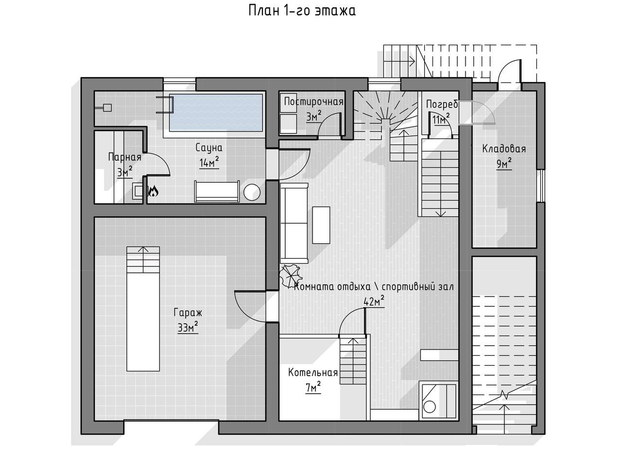 На первом этаже располагаются комната общего назначения, баня, бассейн,  тренажерный зал, погреб, электро и твердотопливный котел (установлен в целях экономии) и гараж со смотровой ямой.