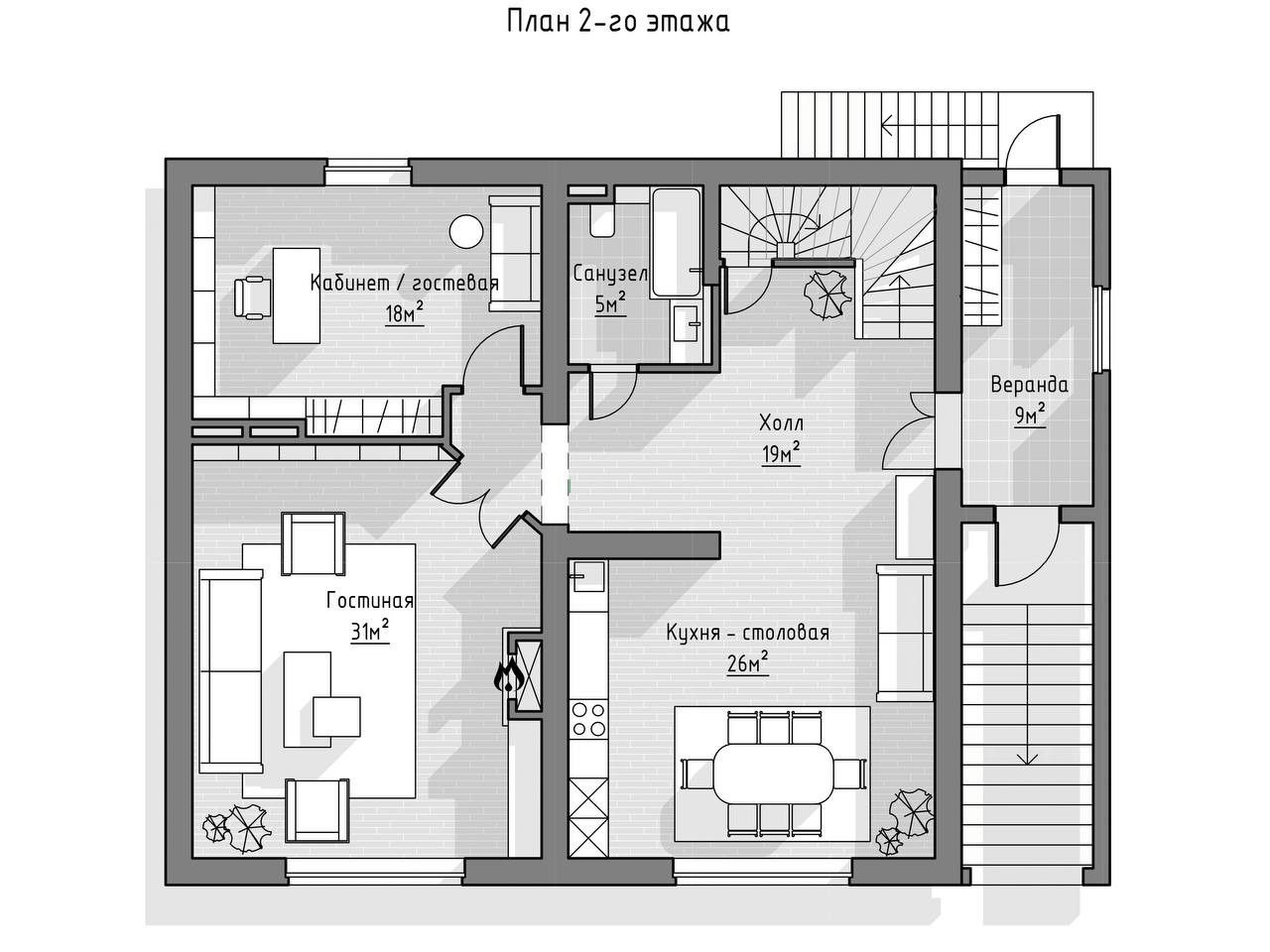 На втором этаже расположены веранда, хол, большая кухня - гостиная с камином, гостевая комната, совмещённый санузел.