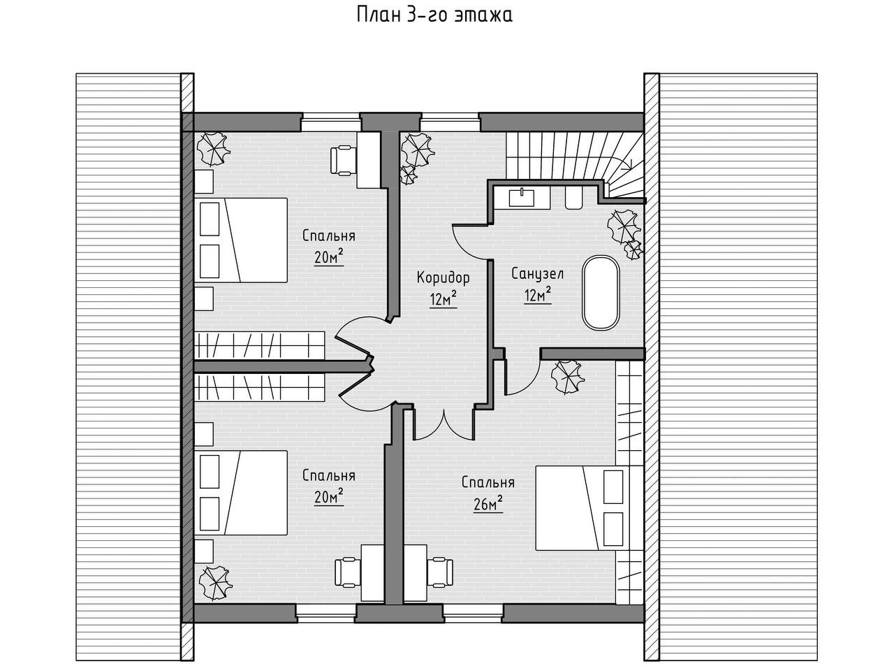 Третий этаж готов под черновую отделку, где спланировано 3 комнаты и санузел.