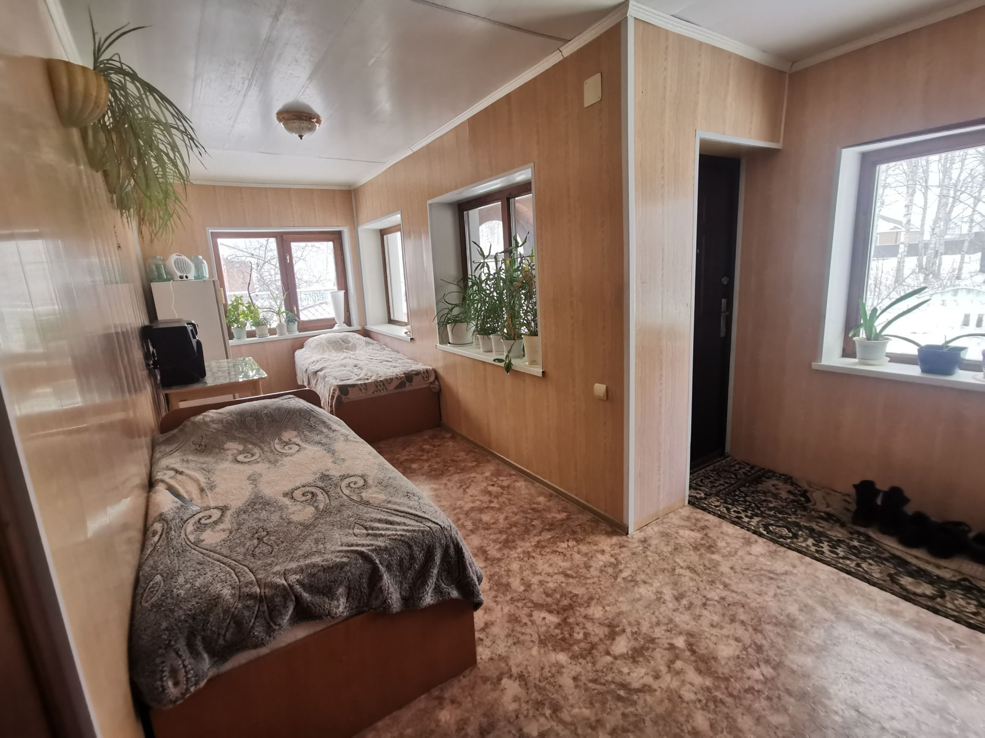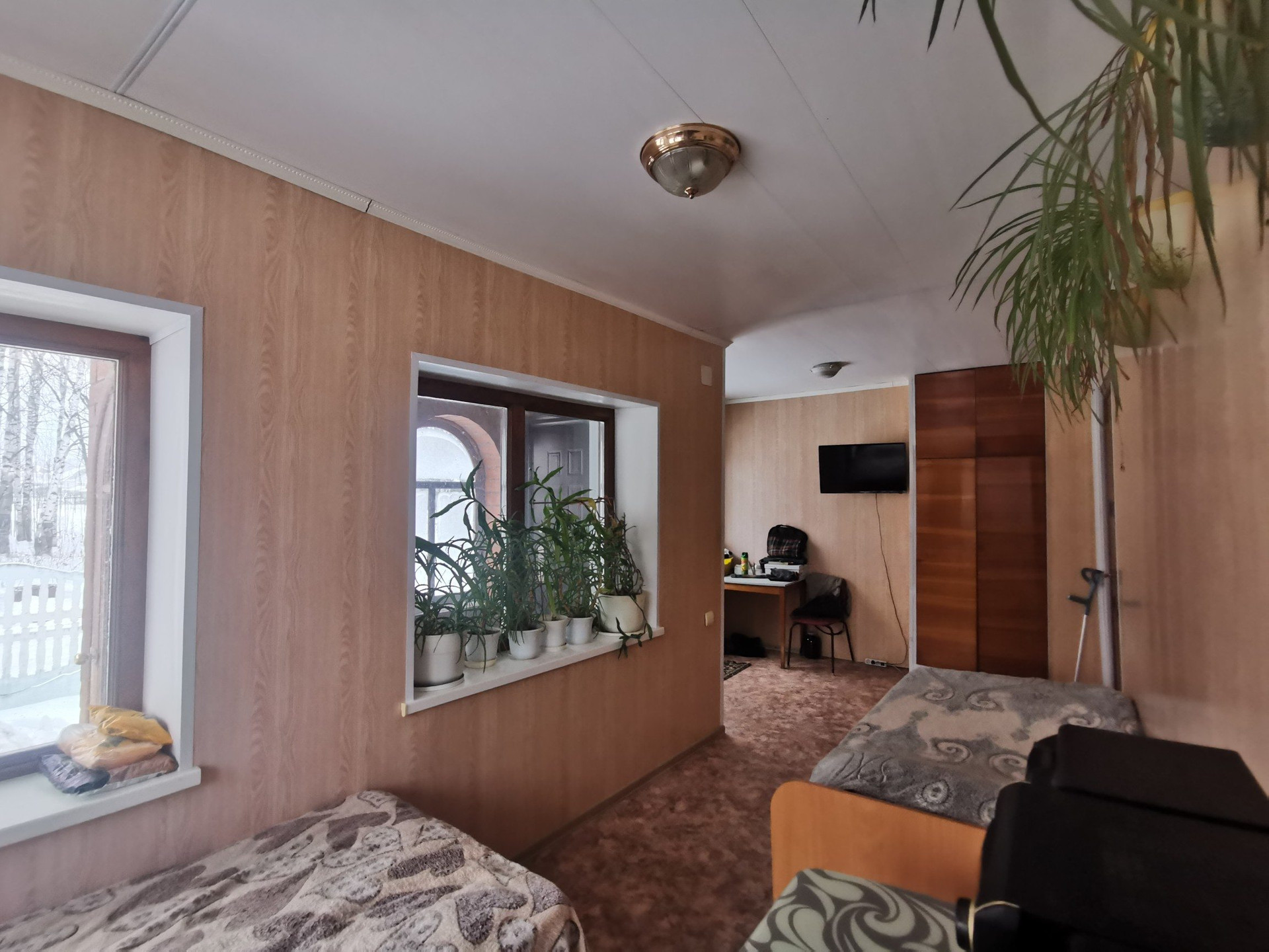 Дом из ж/б панелей утепленный и обшитый сайдингом, очень теплый, есть возможность регулировки температуры. Состояние комнат жилое, но требует как минимум косметического ремонта. Веранда кирпич+сайдинг. Под жилым этажом дома такое же площадью подвальное теплое и сухое помещение с высоким потолком, при желании там можно оборудовать жилые комнаты, сауну, кабинет, мастерскую, бассейн и т.п. Над жилым этажом - летняя мансарда, там уже сделана черновая отделка для расширения площади дома. Жилая площадь 80 кв.м. (исходя из этой площади считаются коммунальные платежи), но по факту, вместе с теплой верандой жилая - более 100 кв.м. За счет подвала и мансарды легко можно увеличить до 200.